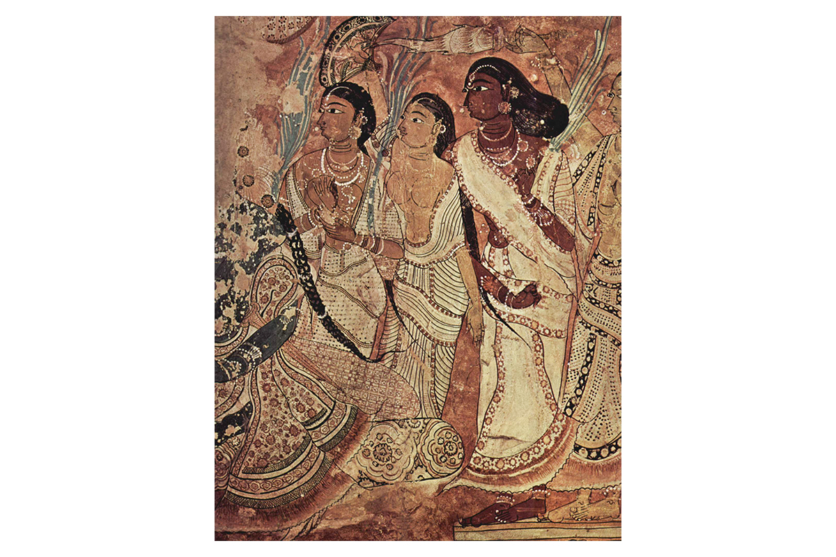 The earliest references to the Nivi drape date back to the Vedic period. An eighth century literary text, Haribhadra’s Samaraiccakaha, describes a woman dressing up in a “nivi sari.” The frescoes of the Ajanta Caves also showcase drapes that are reminiscent of the Nivi drape and feature front pleats. Some theories attribute the Nivi drape to the Dravidas, noting its similarities to the veshti worn in South India, which also involved the pleating and tucking of fabric at the navel. Furthermore, the lower garment commonly worn by women in this period was called the nivi or the nivi bandha, supporting the theory that the Nivi drape originated in Andhra Pradesh.