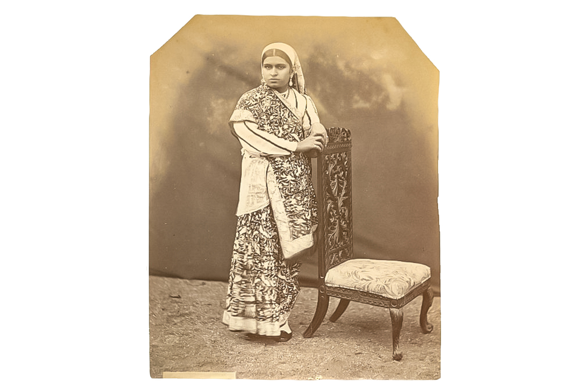 Other scholars have credited the invention of the contemporary Nivi drape to Jnanadanandini Devi, wife of Satyendranath Tagore, the elder brother of writer Rabindranath Tagore. In Bengal, sarees were traditionally worn without a blouse or a petticoat. In 1964, however, Devi relocated to Bombay (now Mumbai), where such a style was considered unsuitable for public use, forcing her to wear tailored dresses that mimicked a draped saree. After noticing the way Parsi women in Bombay wore sarees at the time – with a blouse and petticoat, and the pallu draped over the right shoulder – she was inspired to adopt what is now known as the Nivi drape. She shifted the pallu from the right to the left shoulder in order to use her right arm freely, consequently increasing the length of her sarees from the traditional five-yards to almost six yards, which remains the standard saree length today. In Calcutta (now Kolkata), this style came to be known as the Bombay Dastur and became popular across the city owing to Devi’s willingness to teach this drape to other women.