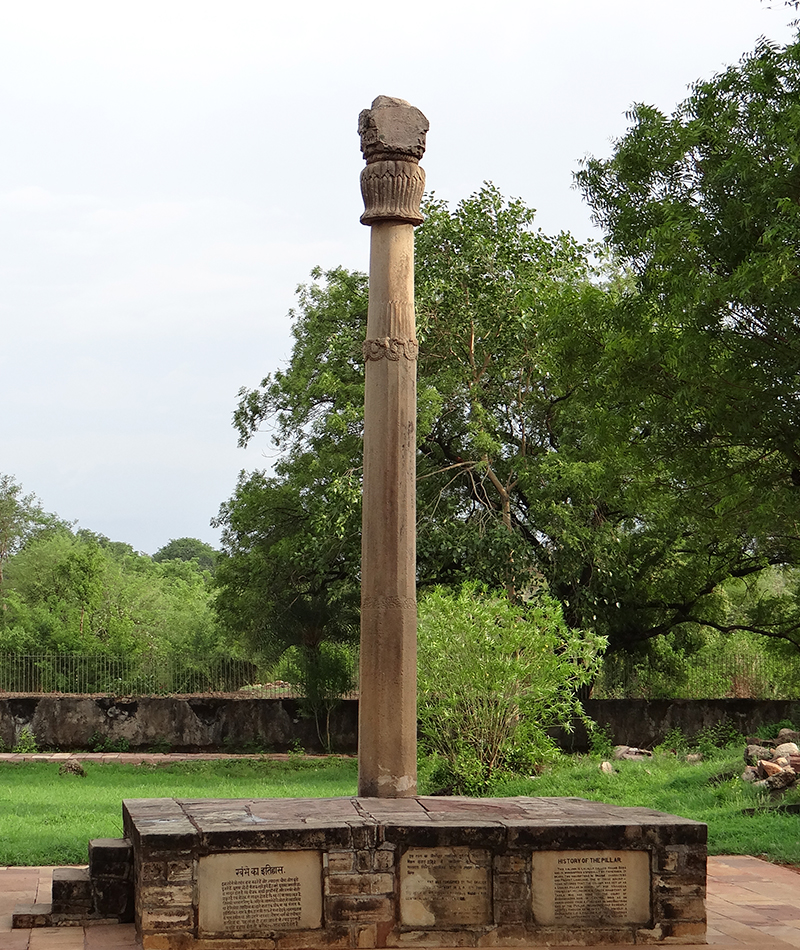 The pillar’s shaft is divided into three segments crowned by a decorated but heavily damaged abacus. The lower, middle and upper segments have eight, sixteen and thirty-two sides respectively, with the upper being the shortest. The border between the lower and middle segments is decorated with a carved ring of low relief floral half-medallions. The middle and upper segments are in turn separated by a mid-relief garland of entwined vines looped around honeysuckle flowers and fruits, and held up by pairs of geese. Above the upper segment is a smooth cylindrical segment surmounted by the capital, which consists of an upturned bell-shaped lotus base and a damaged cubical abacus that seems to have featured animal motifs, possibly mythical birds and hybrid creatures. The inscriptions suggest that a sculpted figure of Garuda in an earlier, less anthropomorphic form may have surmounted it. The lime mortar base of the pillar presents one of the earliest pieces of evidence of cement binding in India.