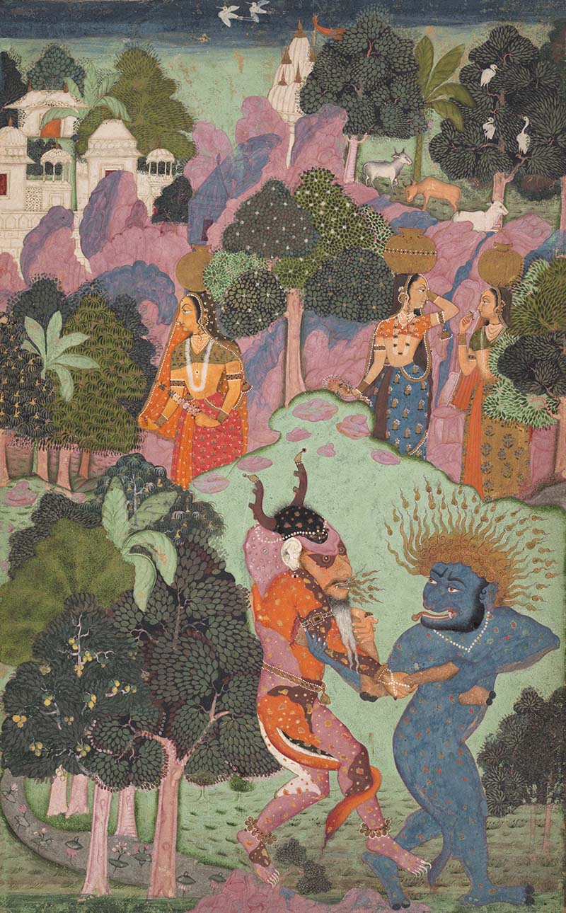 Rajput rulers also formed close alliances with the Mughal dynasty which gained centralised power in the Indian subcontinent from the mid-sixteenth century onwards. Alongside other social and cultural exchanges between the Mughal and Rajput courts, the influence of Mughal miniature painting became increasingly pronounced in the manuscript traditions in Rajasthan and beyond. The kitabkhanas — libraries and book-making workshops — of the Mughal court invited artists from all over the empire, and beyond. Among them were a large number of specialists, including calligraphers, colourists and painters, working together in a highly organised environment to produce lavish manuscripts. In the Rajput context, however, manuscript-painting teams often simply comprised the extended families of painters, who were sometimes present at court and at other times worked from their family homes in the small towns and cities of the kingdom. At the same time, the smaller Rajput principalities in central India also carried forward the longstanding traditions of the Malwa school of painting, after the fall of the Malwa kingdom’s capital Mandu in the second half of the sixteenth century. These diverse influences were amalgamated in various ways to give birth to a series of regional styles.