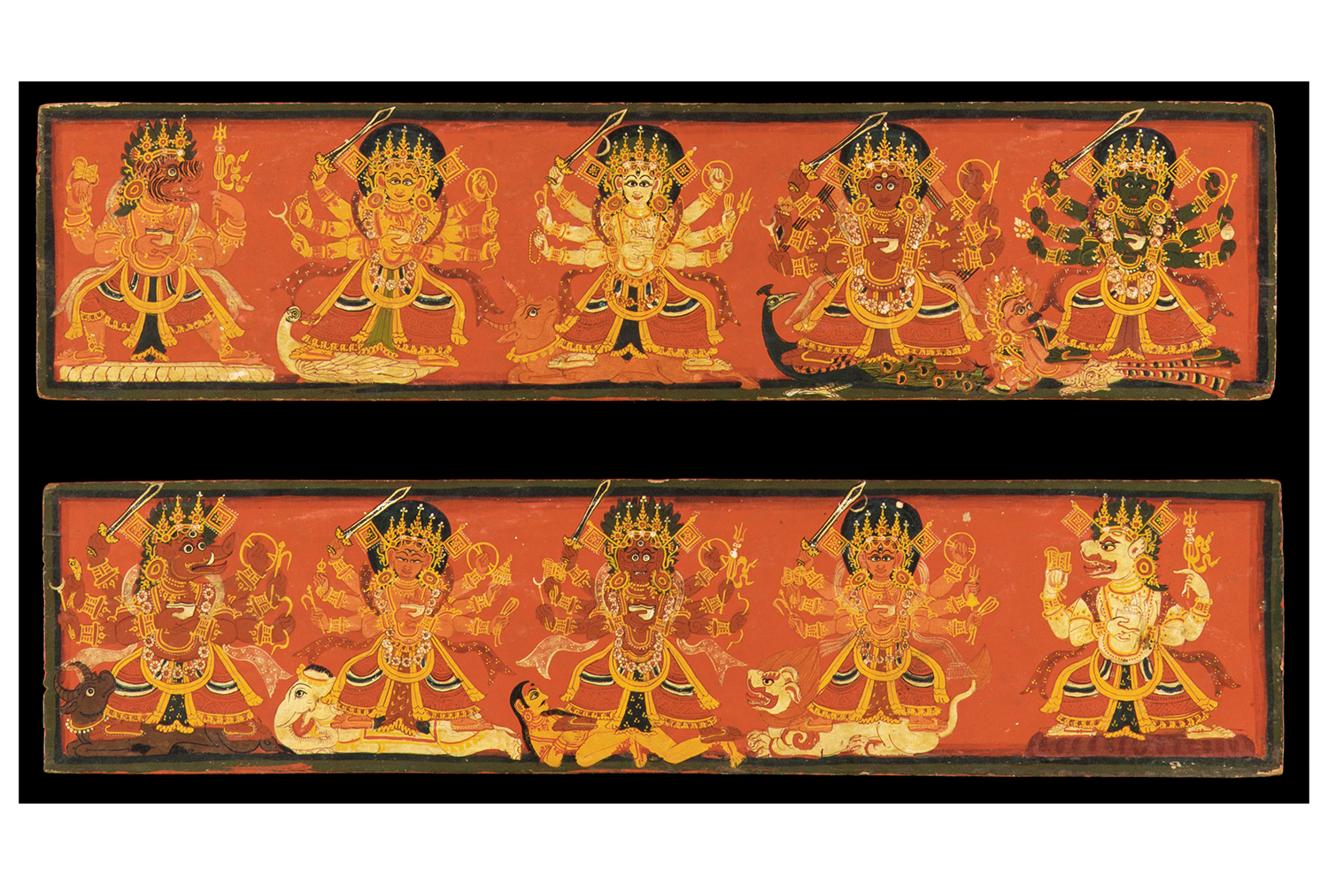Six of the seven goddesses are also considered emanations of a god, who can be considered the divine male counterpart or purusha, and they are depicted with the same weapons and mounts as the gods. The goddesses, listed in the order they are typically depicted in, are Brahmani, the four-headed counterpart of Brahma; Maheswari, the counterpart of Shiva, who is also known as Maheshwar; Kaumari, the counterpart of Kumara, also known as Kartikeya, Skanda or Murugan; Vaishnavi, or Narayani, the counterpart of Vishnu, also known as Narayana; the boar-headed Varahi, counterpart of Varaha; Indrani or Aindri, the counterpart of Indra; and Chamunda, the only goddess who is not the counterpart of a male god, but represents a female form of Shiva’s power. Occasionally, the goddesses are depicted as a larger group of eight or nine, with the presence of Maha Lakshmi, Chandika, Narasimhi or Vinayaki.