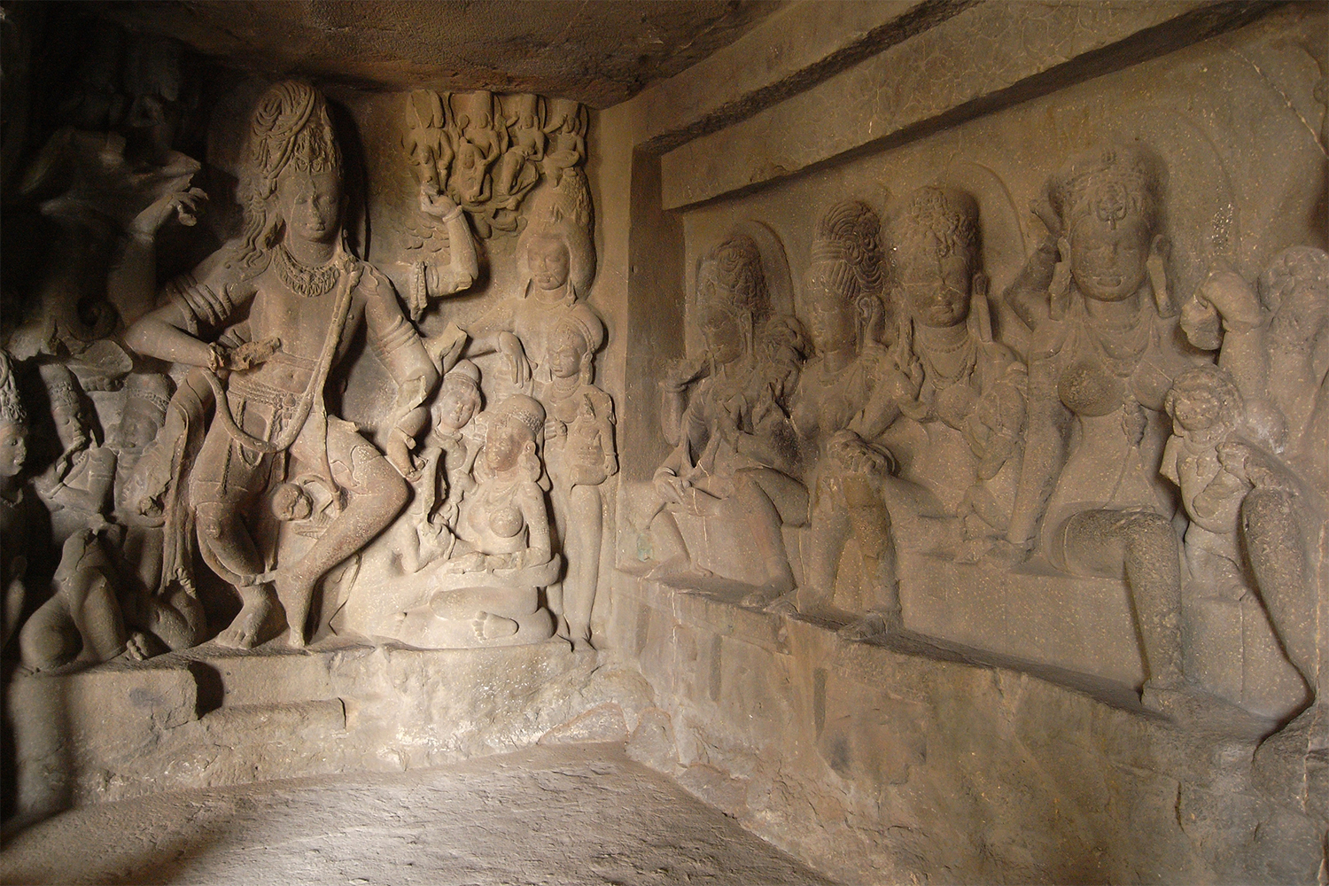 The Saptamatrikas are generally carved in relief stone slabs in their sequential order. They are typically flanked by two male figures: a malevolent form of Shiva as Virabhadra, and his son Ganesha. The Saptamatrikas are popularly considered Shaivite goddesses, as evidenced by their image at the Rameshwara Cave, Ellora, a cave dedicated to Shiva,one of four depictions in Ellora.