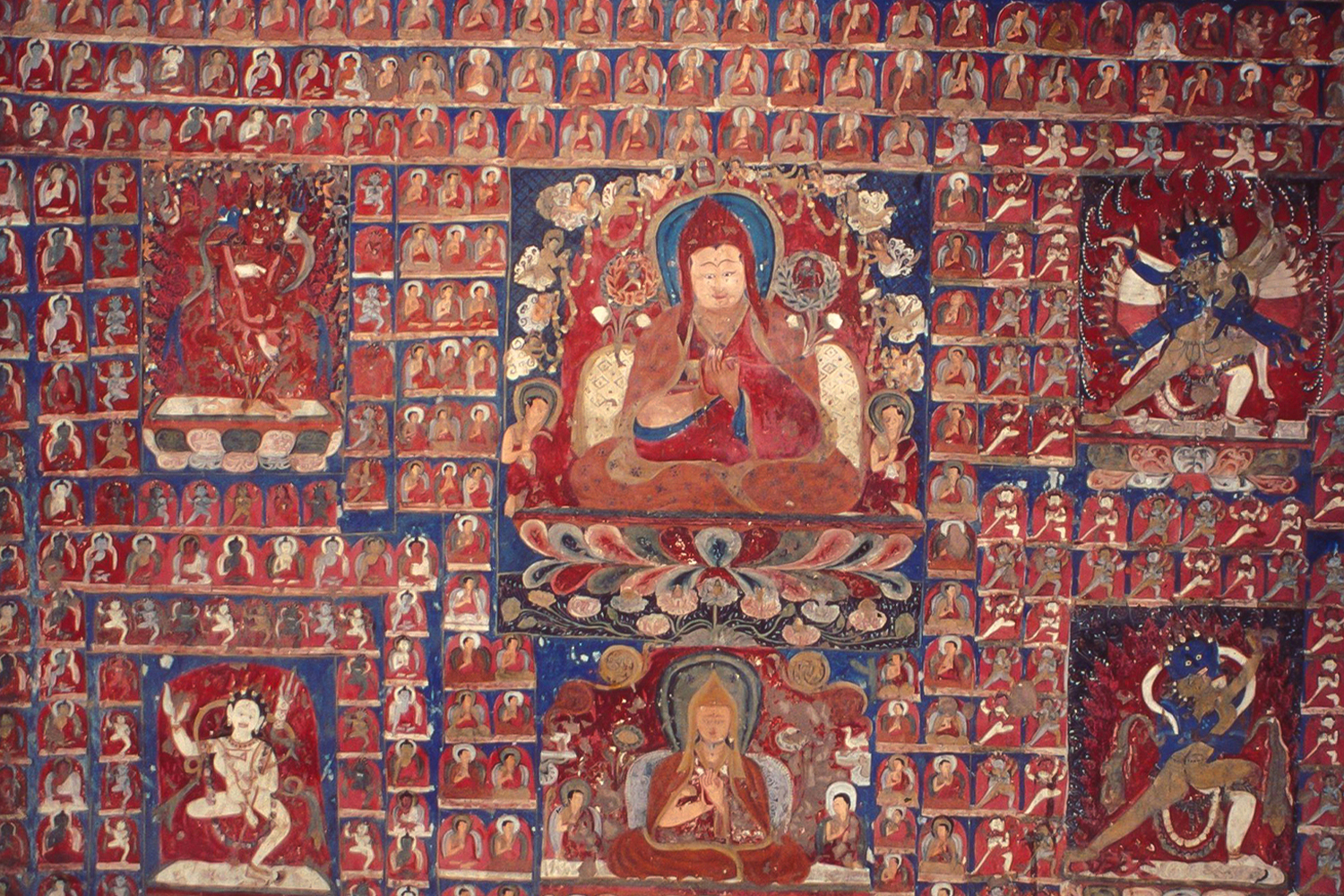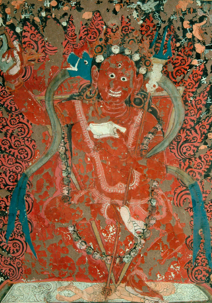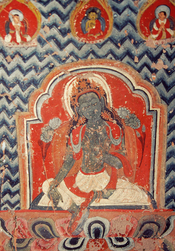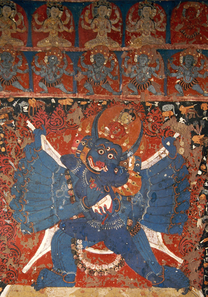 The southwestern wall has two paintings of Vajrapani, one peaceful and the other wrathful. In the latter form, five figures of Garuda, each in a different colour, are painted along Vajrapani’s body, corresponding to the five chakras of the body.
