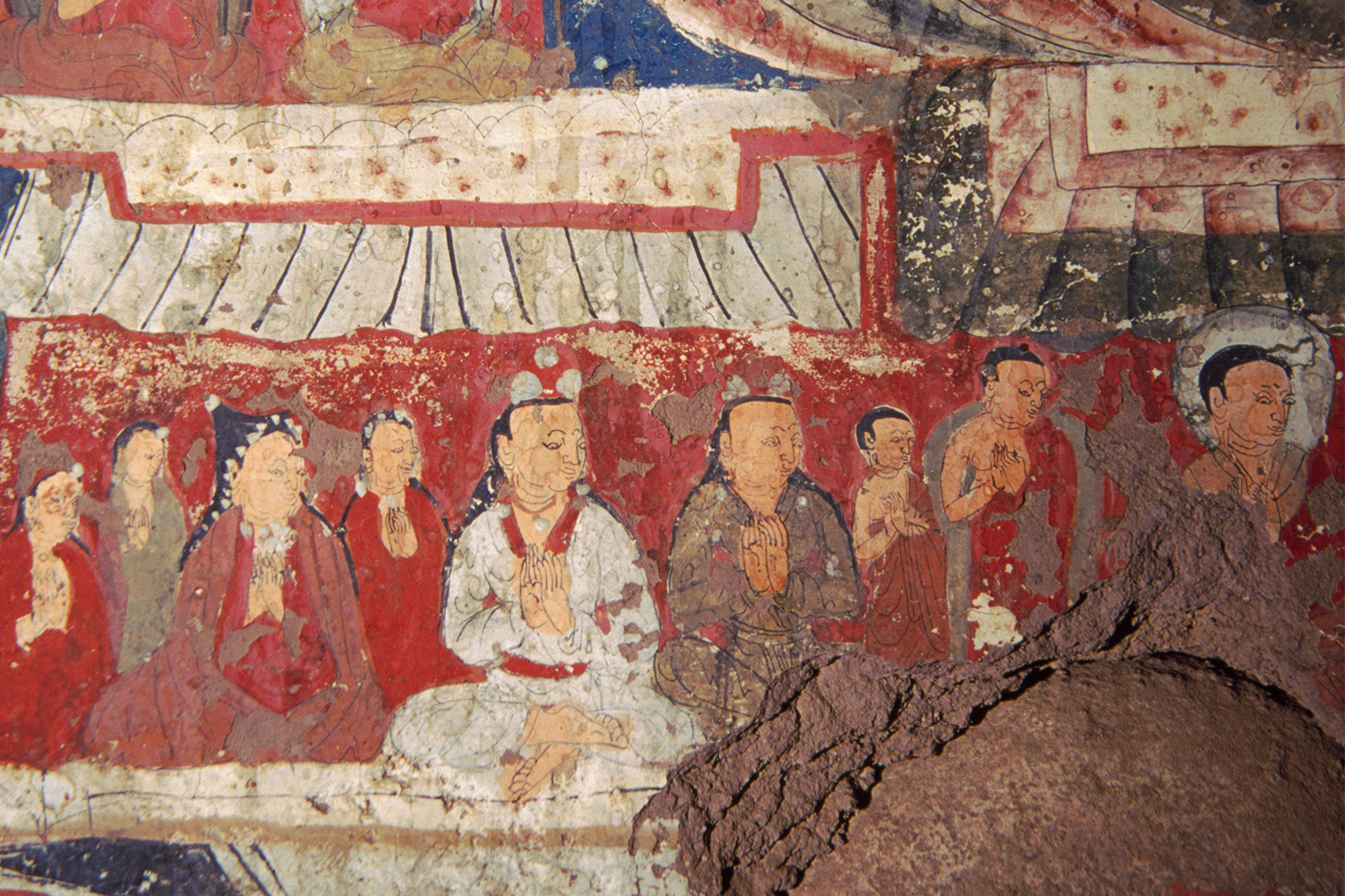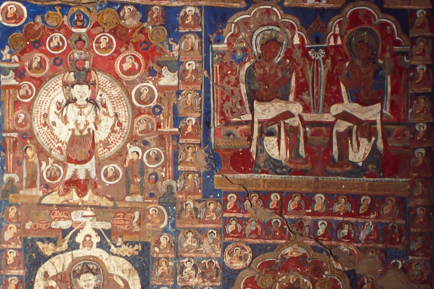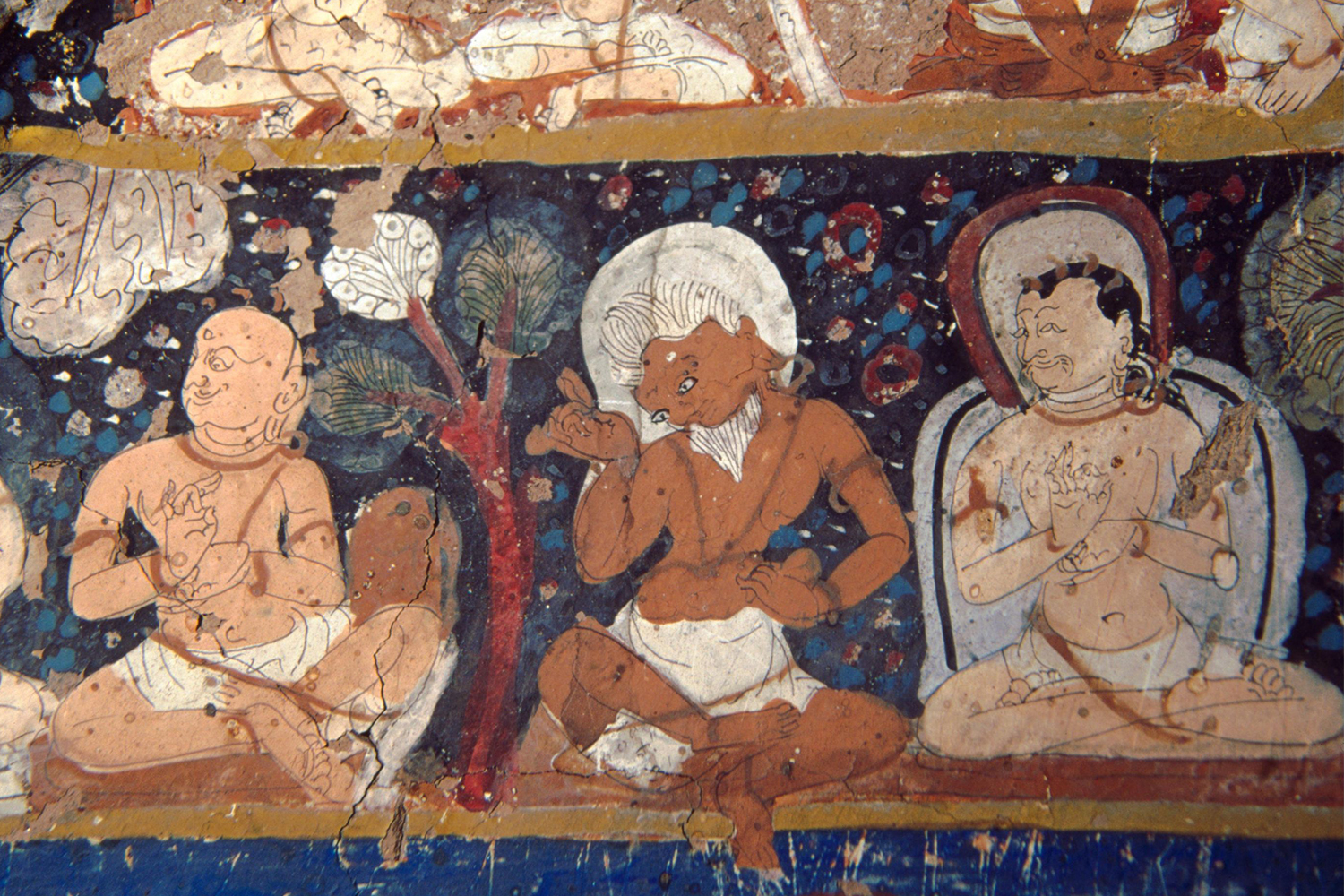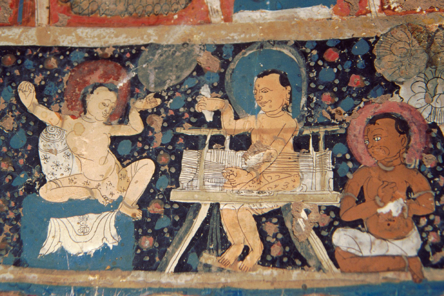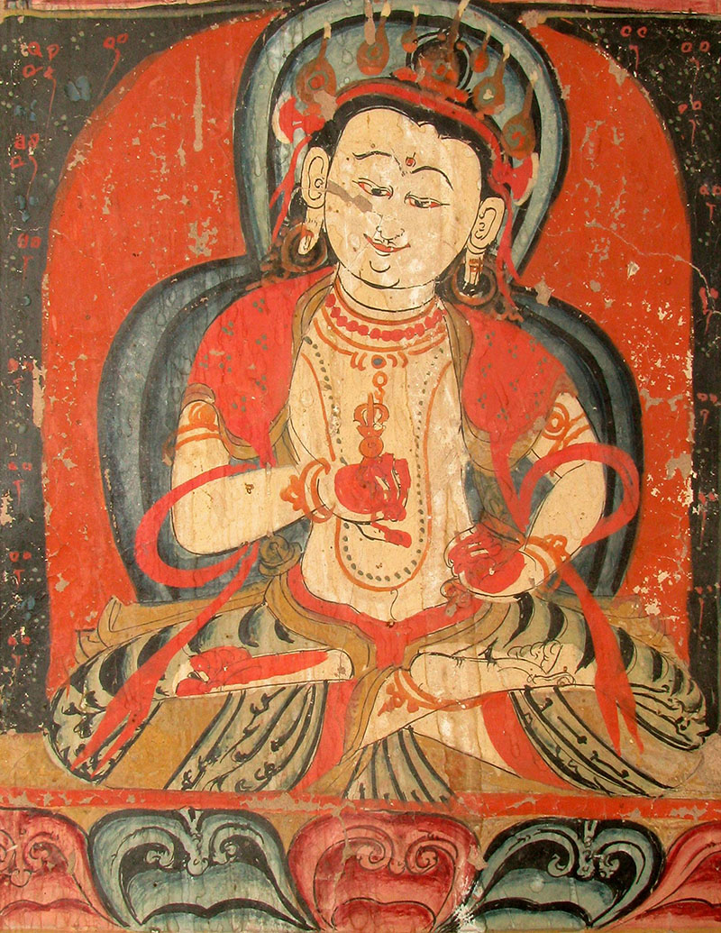 On the southern wall, two bodhisattvas identified as Manjusri and Maitreya are next to an image of Avalokiteshvara. Recognisable through their attributes, the two are seated on a lotus flower, with a sword and book next to Manjusri and a vase-shaped jug and three small stupas next to Maitreya. These figures have eyes drawn on them; a motif that can be seen from the thirteenth century onwards in other temples, such as the Tsatsapuri at Alchi and the Nyarma Stupa. Under this image is a rare painting of Vajravidarana, or the conqueror of Vaja, a deity in Mahayana Buddhism. Painted in blue, the figure is flanked by birds. On the same wall is another painting of Amitabha, similar to the one found in Cave 2.