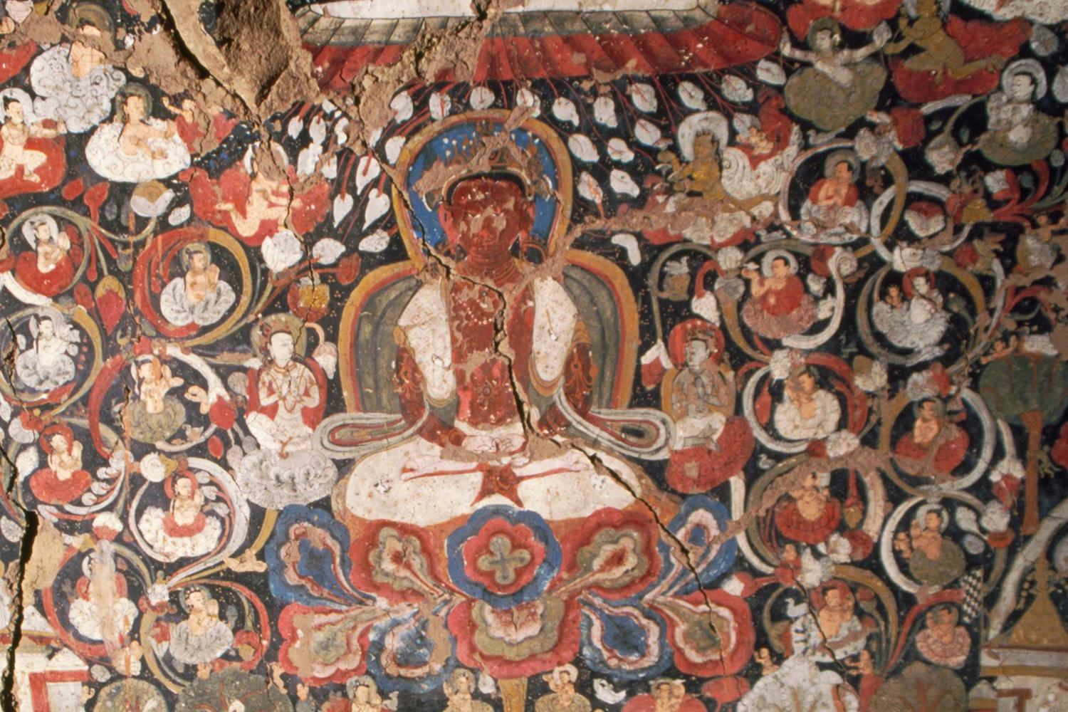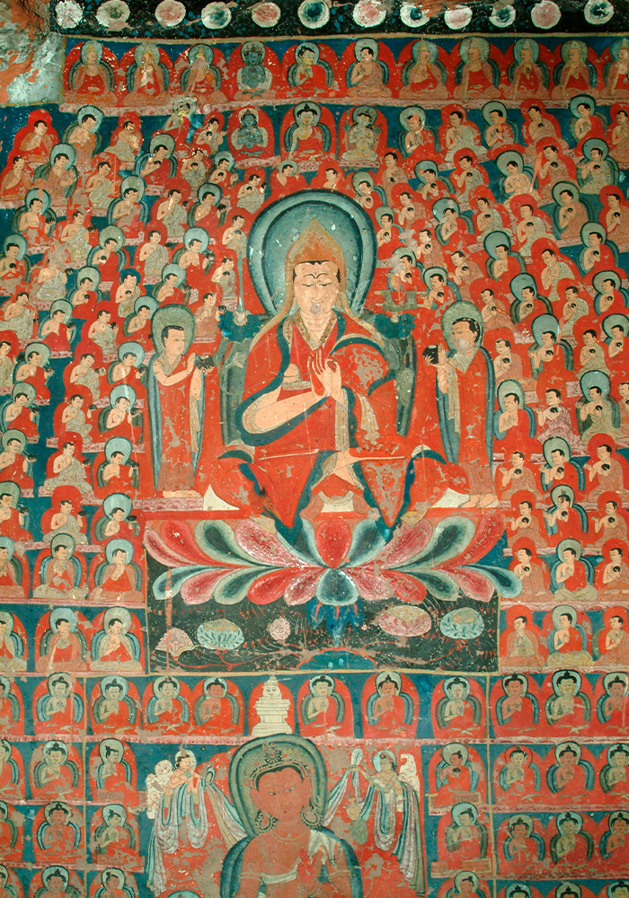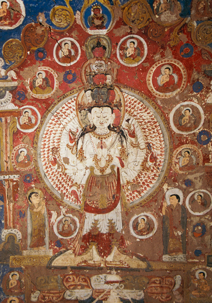 On the bottom section of the southern wall of Cave 2 is an image of Amitabha in Sukhavati, meaning ‘the land of bliss’. The image draws from the text of the Sukhavativyuha Sutra and shows its inhabitants, including bodhisattvas and flying beings adorned with jewellery, taking gifts to the Buddha. There is an image of Ekadasa Mukha, who is considered spiritually linked to Amitabha, on the western section of the wall. He is flanked by two forms of Tara. Four bodhisattvas are painted above him, depicting the last two of the eleven heads of Avalokiteshvara, including Sadakasara and Manjusri on a lion.