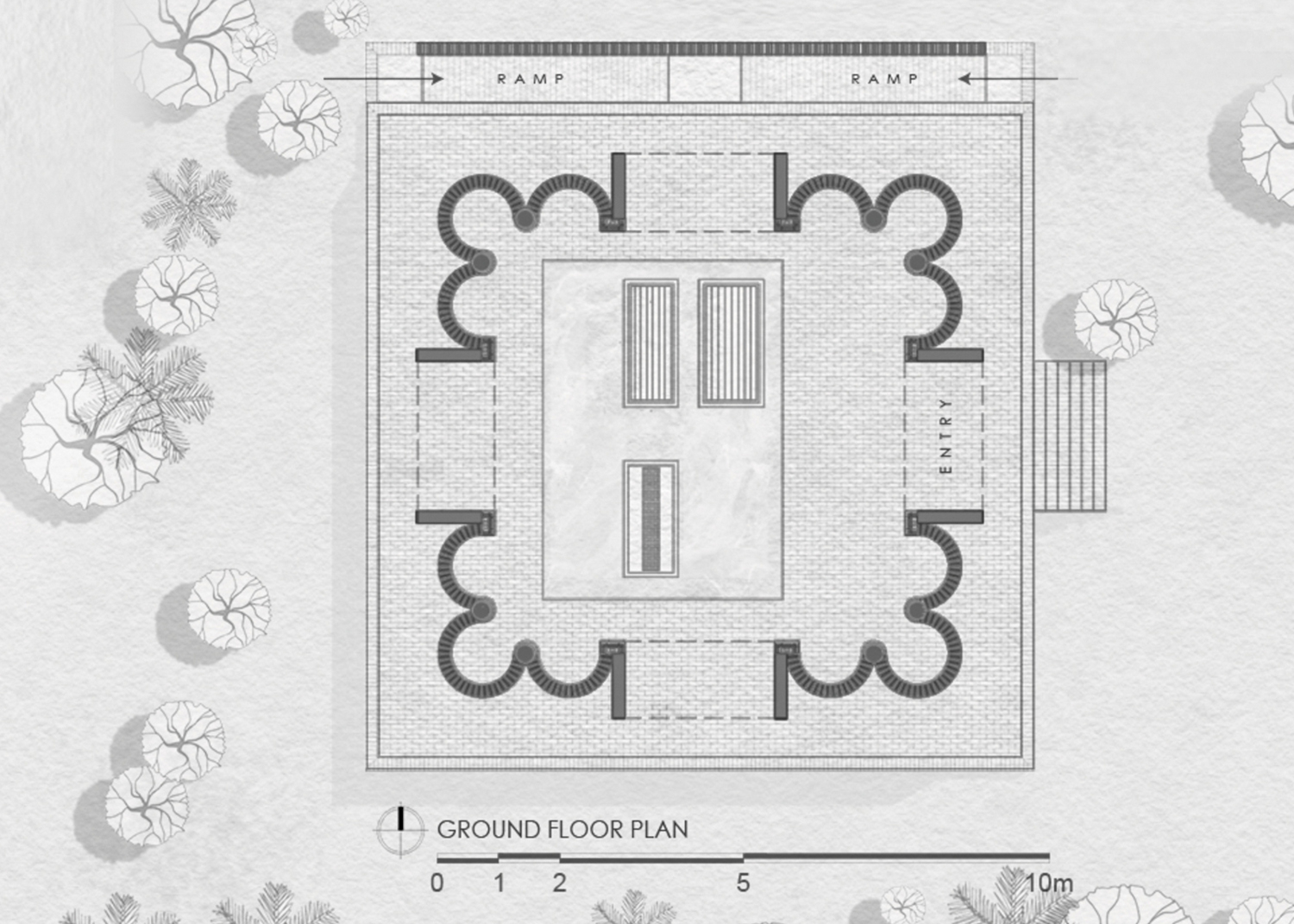 The square plan references those of traditional huts in Bengal as well as the most commonly used plan in historic Islamic tombs across the subcontinent. The dargah is inspired by the turreted, multi-domed mosques of the sultanate period, in particular the fifteenth-century Noy Gambuj or ‘Nine Dome’ Mosque in Bagerhat, southern Bangladesh, named for the nine domes forming its roof in a 3 x 3 grid. The same format has been revealed in the ruins of the eighth-century Noh Gonbad Mosque, Balkh, in northern Afghanistan. The Shah Muhammad Mohshin Khan Dargah multiplies this into a 6 x 6 grid of circular perforations on a flat roof, instead of domes, with a corresponding square-grid waffle ceiling on its underside. Each of the four faces of the building is inset with a simple, roughly 3-metre-square doorway at its centre, emphasising accessibility and intimacy over the grandeur often conveyed by traditional Islamic religious architecture.