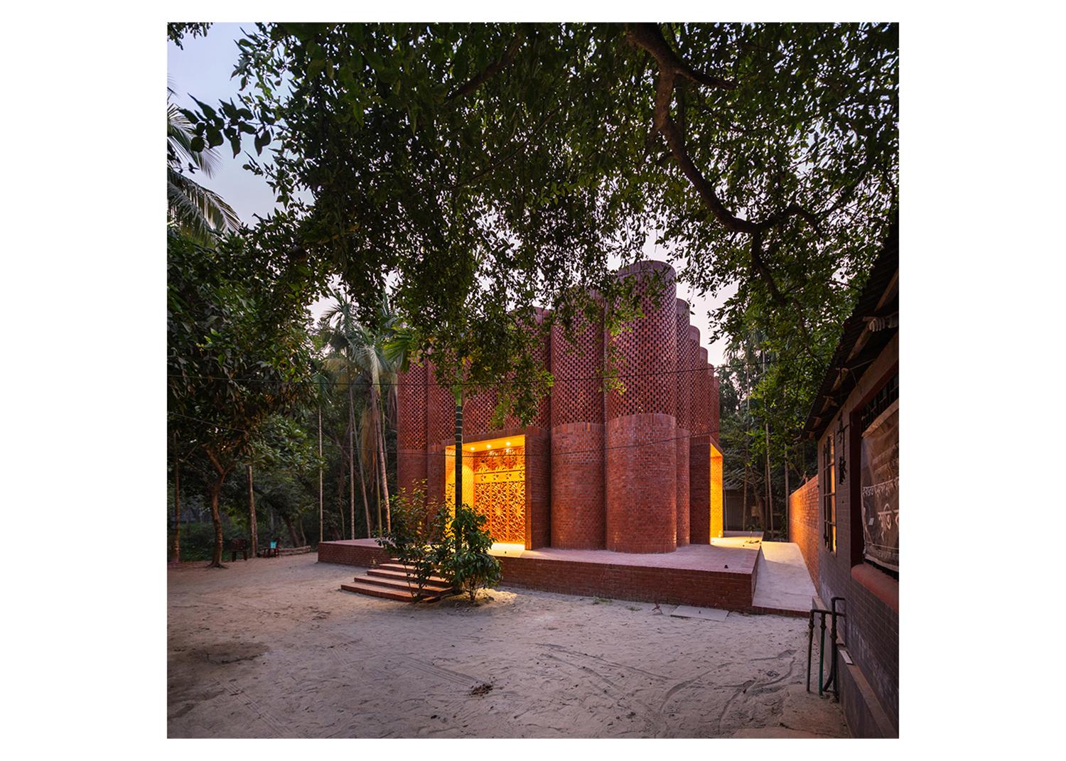 The Dhaka-based architectural firm Sthapotik, led by Sharif Uddin Ahammed, is known for its traditionally-inspired, environmentally-responsive design practice. Besides the design elements adapted from vernacular and historic local architecture, this project employed local artisans and used materials sourced from near the site, such as the metal for the doors and the naturally baked bricks, made from the red clay widely available and commonly used in the region. This also served to keep building costs low to suit the limited budget for the project.