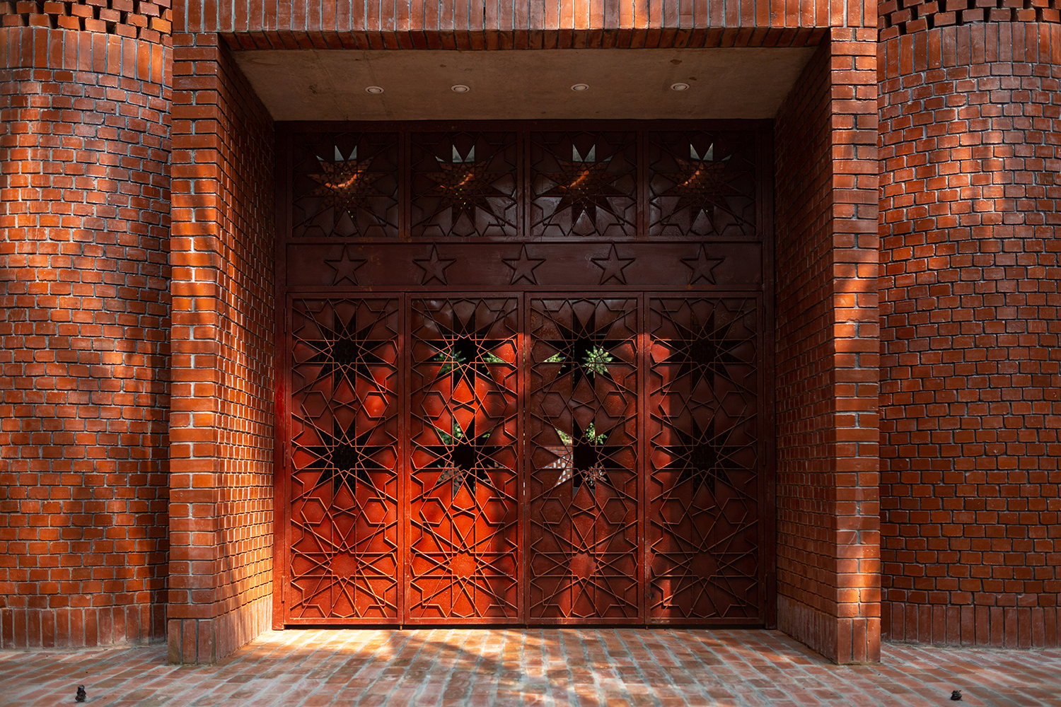 This feature, called the ‘chandelier of paradise’, is central to the symbolism of the shrine — dargah in Persian translates to ‘portal’ and connotes the mausoleum’s religious function as a home for the deceased’s body while the soul ascends upwards to heaven and is blessed by celestial light. Traditionally this is symbolised by a centrally installed chandelier, interpreted here as hollow vertical passages that direct natural light onto the graves and the rest of the mausoleum chamber. In addition, the metal doorways on all four sides are decorated with geometric Islamic girih (knotwork) patterns and cutouts that throw daylight onto the floor in twelve-pointed-star patterns.