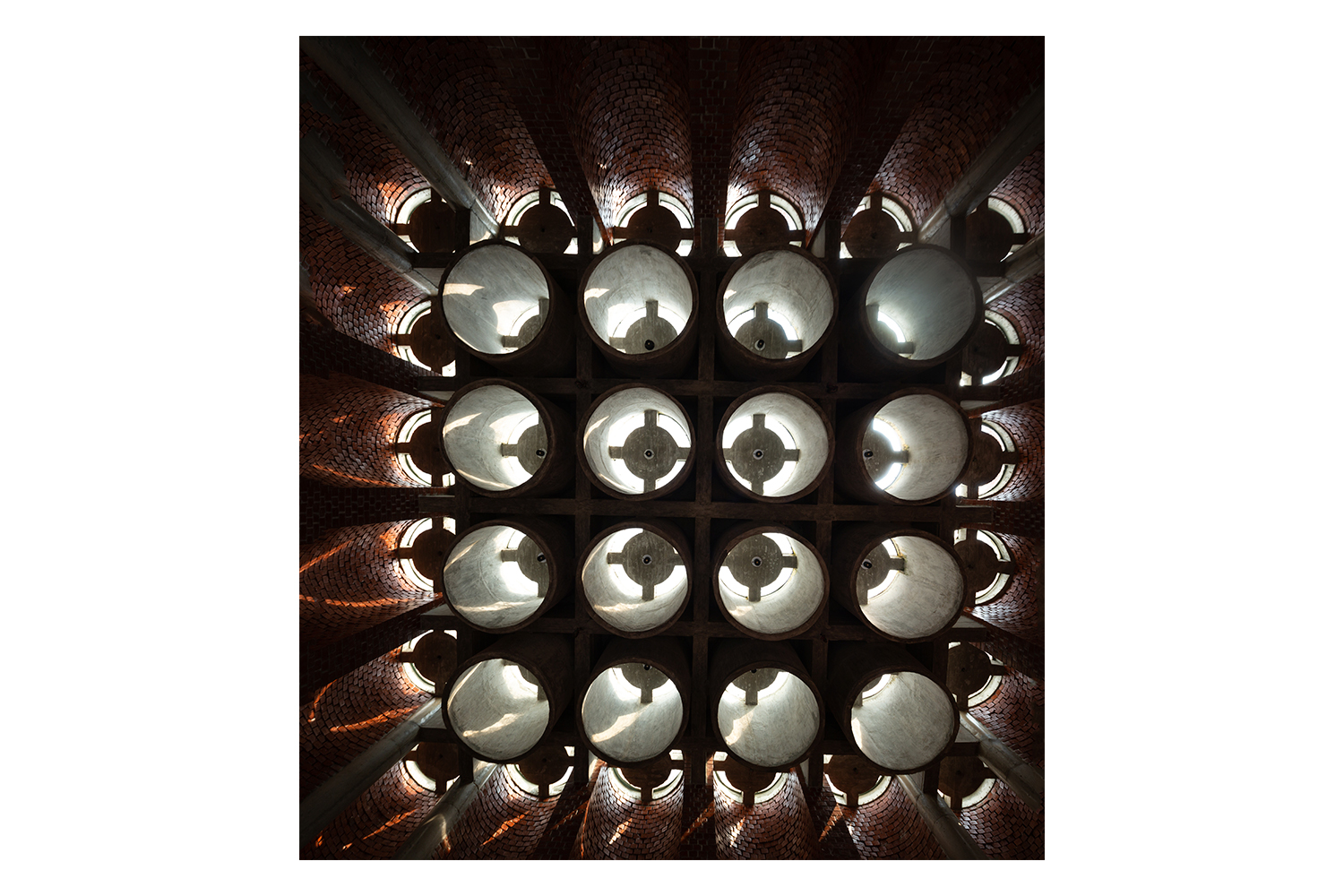 The interior of the dargah is an undivided, square single-storey space. The floor is brick, over which mats and carpets are spread when the dargah is open to visitors. At its centre is a low square plinth made of marble, holding three marble sarcophagi, with a space left for the sarcophagus of Khan’s son, the dargah’s patron. Overhead, a cluster of sixteen exposed-concrete tubes almost 2 metres long are extended downward from the perforated circles on the roof, forming deep skylights.