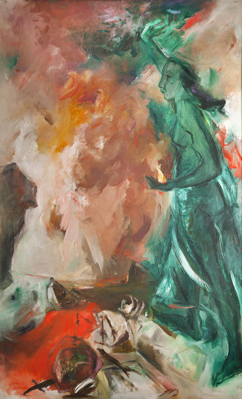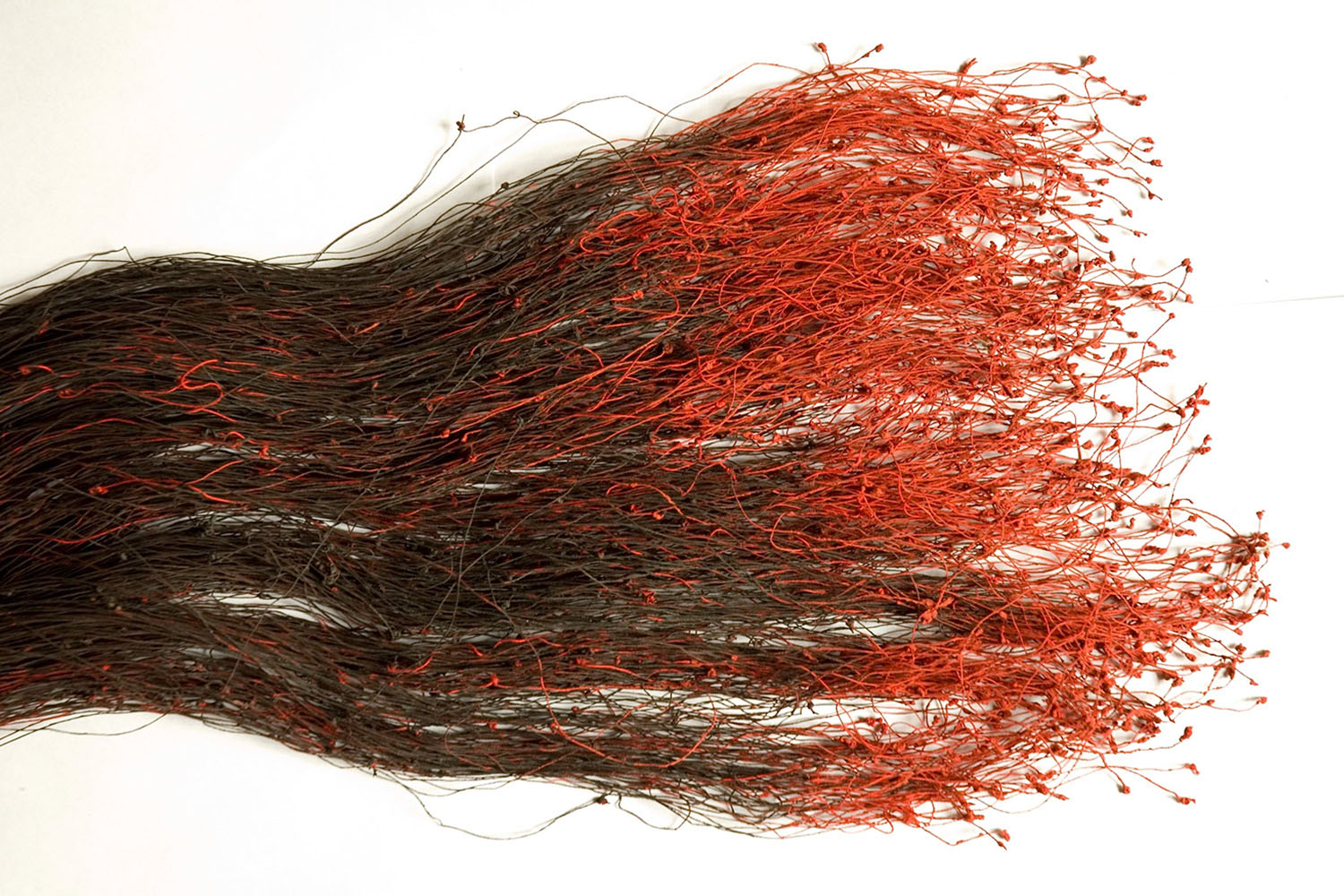 Her early exposure to folk art and the influence of her mentor KG Subramanyan and artist Nalini Malini informed her artistic approach. Her early work was mainly restricted to figurative oil painting. However, she began accommodating other materials and media in the 1990s — possibly in response to the outbreak of communal violence, specifically in Mumbai, in the aftermath of the Babri Masjid demolition. Notable works include And Tell Him of My Pain (1998, 2001, 2007) — a series of three large-scale works produced and displayed at different points over a decade. The works feature a spilling mass of cords made of kumkum-coated threads, each 110 metres long, threaded through sewing needles, which are suspended in a bunch at their ends. One of Gowda’s largest works, Behold (2009), was first displayed at the 53rd Venice Biennale and features 4,000 metres of human hair woven into a knotted mass of rope with steel car bumpers enmeshed within it. The work references the hanging of hair talismans from vehicle bumpers in India in a possible parody of the appeal of human material over the materials of Modernism, such as steel. The work was acquired by Tate Modern in 2014.