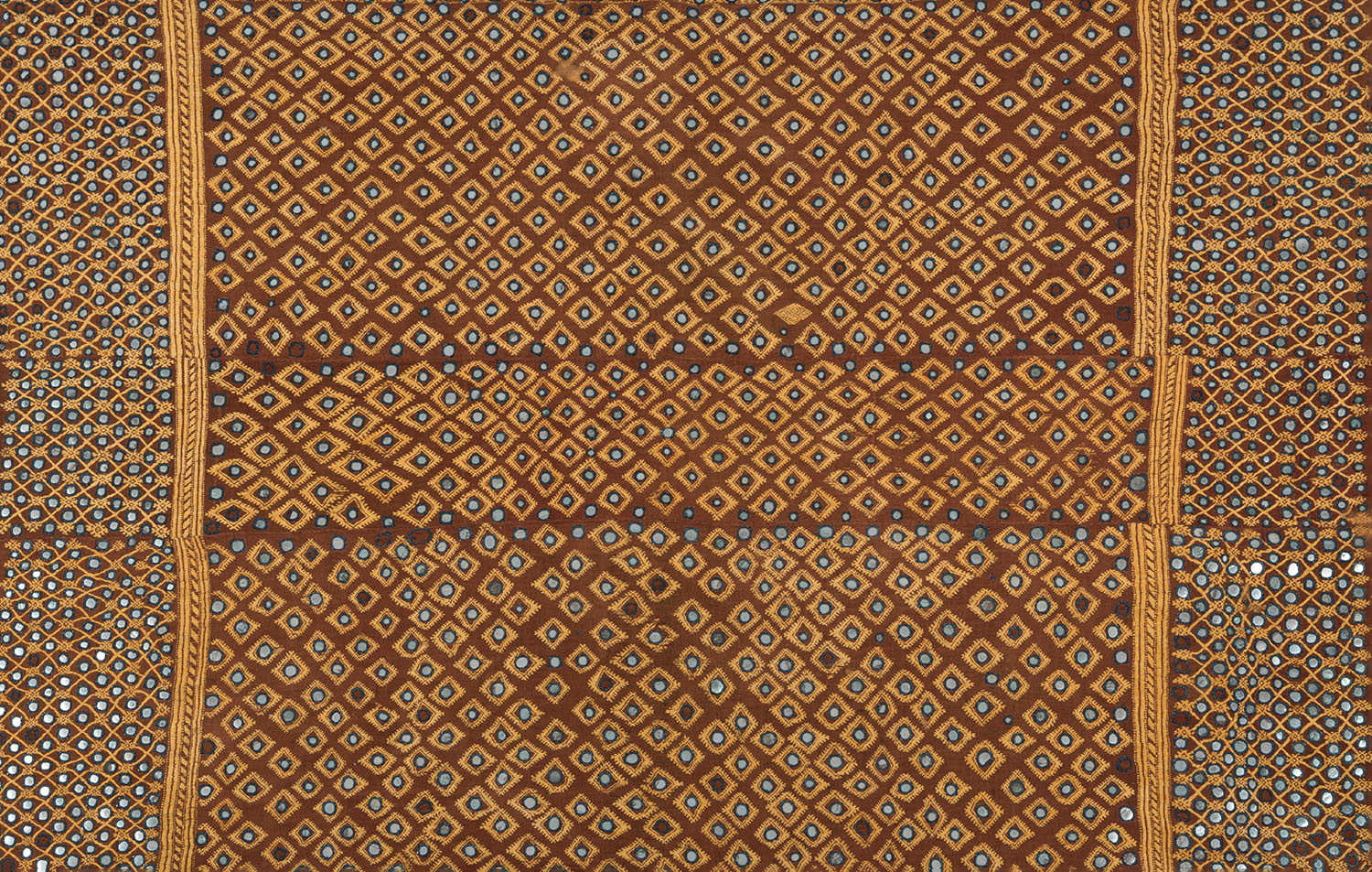 A type of phulkari embellished with sheeshe (small, dull pieces of glass) that are stitched in patterns across the fabric, the shishedar phulkari acts as a nazarbuti for the wearer. While nazarbutis in other phulkaris are typically presented as interruptions in the embroidery pattern, the glass pieces in shishedar phulkaris are a way of incorporating the motif into the overall design.