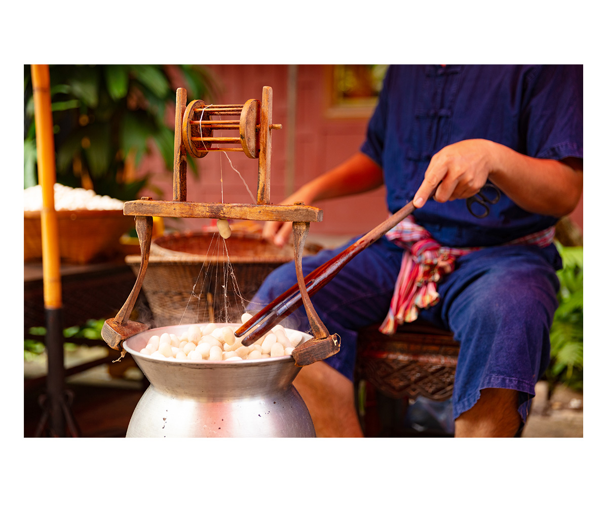 A versatile and durable natural fibre known for its fineness and lustre, silk is generally derived from the cocoons of silkworms through a process called sericulture. While silkworms of the Bombyx and Antheraea genus are most commonly used, there are several varieties of silk based on the species producing it. Mulberry silk, which accounts for 90 percent of the world’s commercial silk, is made from the cocoons of the mulberry silk moth Bombyx mori. Besides this, tussar, muga and eri are important silks indigenous to South Asia. While it is the prism-like cross-section of silk fibres that lend them their distinctive shimmer, the texture, lustre, thickness and natural colour of silk fabric varies based on how its fibres are processed and the type of silkworms they are obtained from.