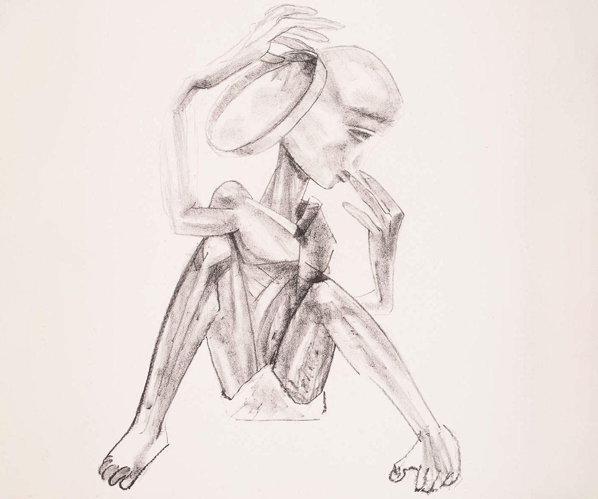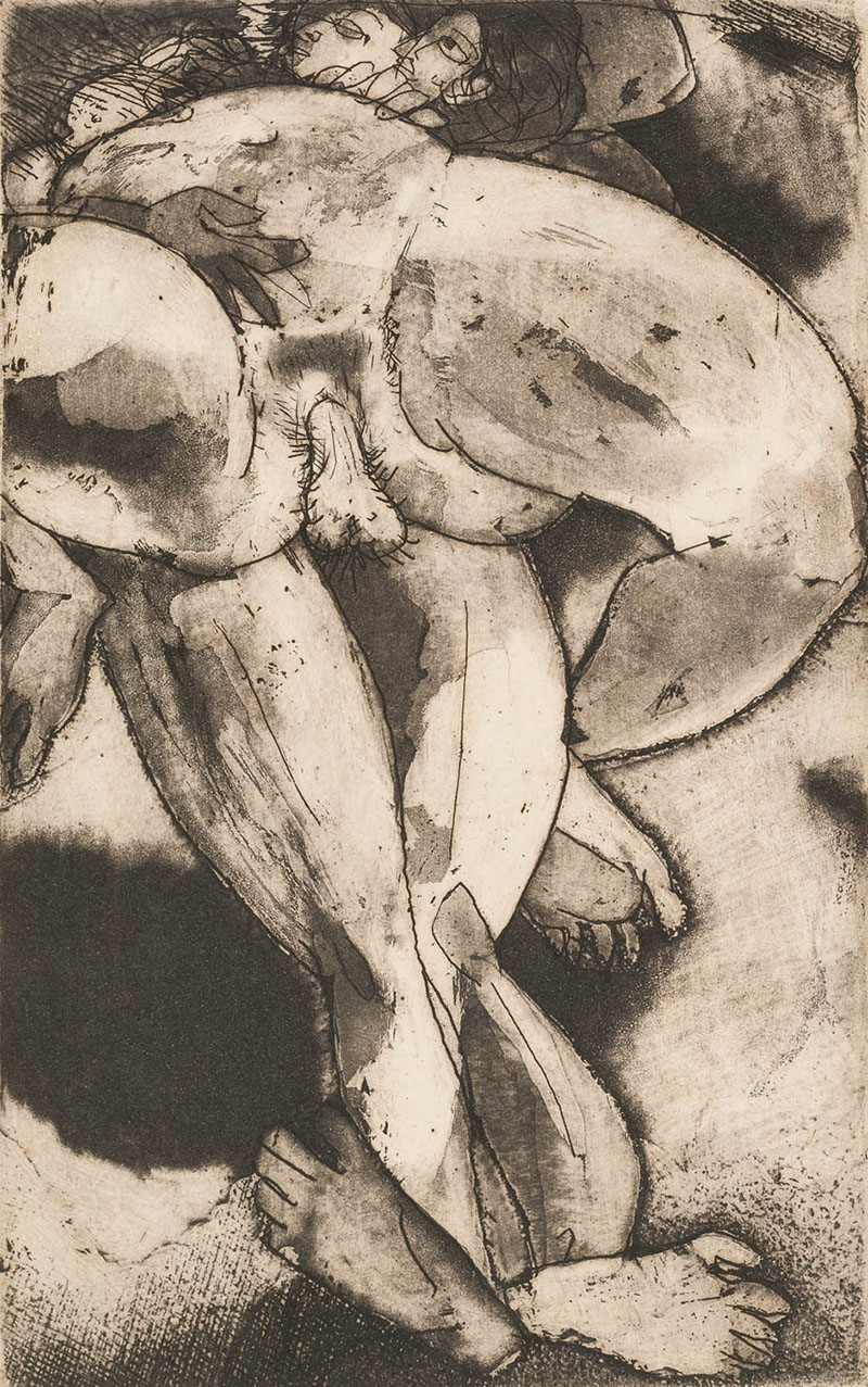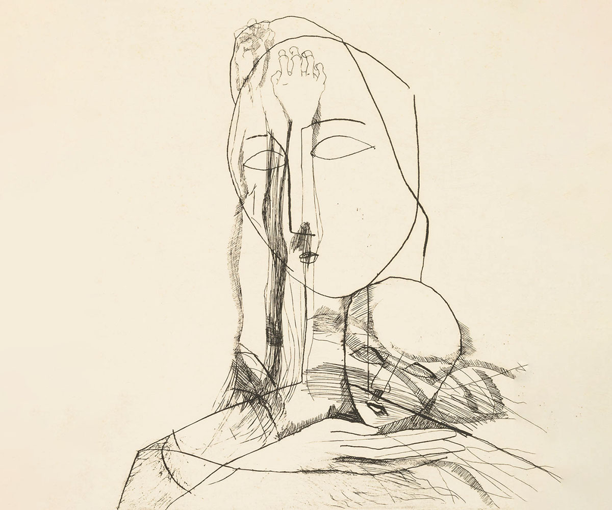 With the banning of the Communist Party in the late 1940s, Hore was forced underground, and was also briefly imprisoned twice, events that interrupted his education. Returning in 1950, he began teaching and producing artwork to sustain himself financially, while experimenting with various forms of printmaking. In 1954, Hore took a teaching position at the Indian College of Arts and Draftsmanship, Calcutta, and began his experiments with intaglio with the desire to build a set of technical skills that would allow him to express his angst at the widespread suffering and sociopolitical strife around him. While initially preoccupied only with the message of his images, he now turned his attention to pictorial language and style. This led to his tentative exploration of abstraction, best typified by the untitled 1956 etching of a sitting figure. His woodcut prints and sketches from this period straddled the conflicting influences of Chinese Socialist Realism, a political art movement that focused on realistic depictions of communist utopia, and German Expressionism, which emphasised the artist’s feelings over replicating reality. By the late 1950s, Hore’s work moved from literal figuration to a more expressionist style.