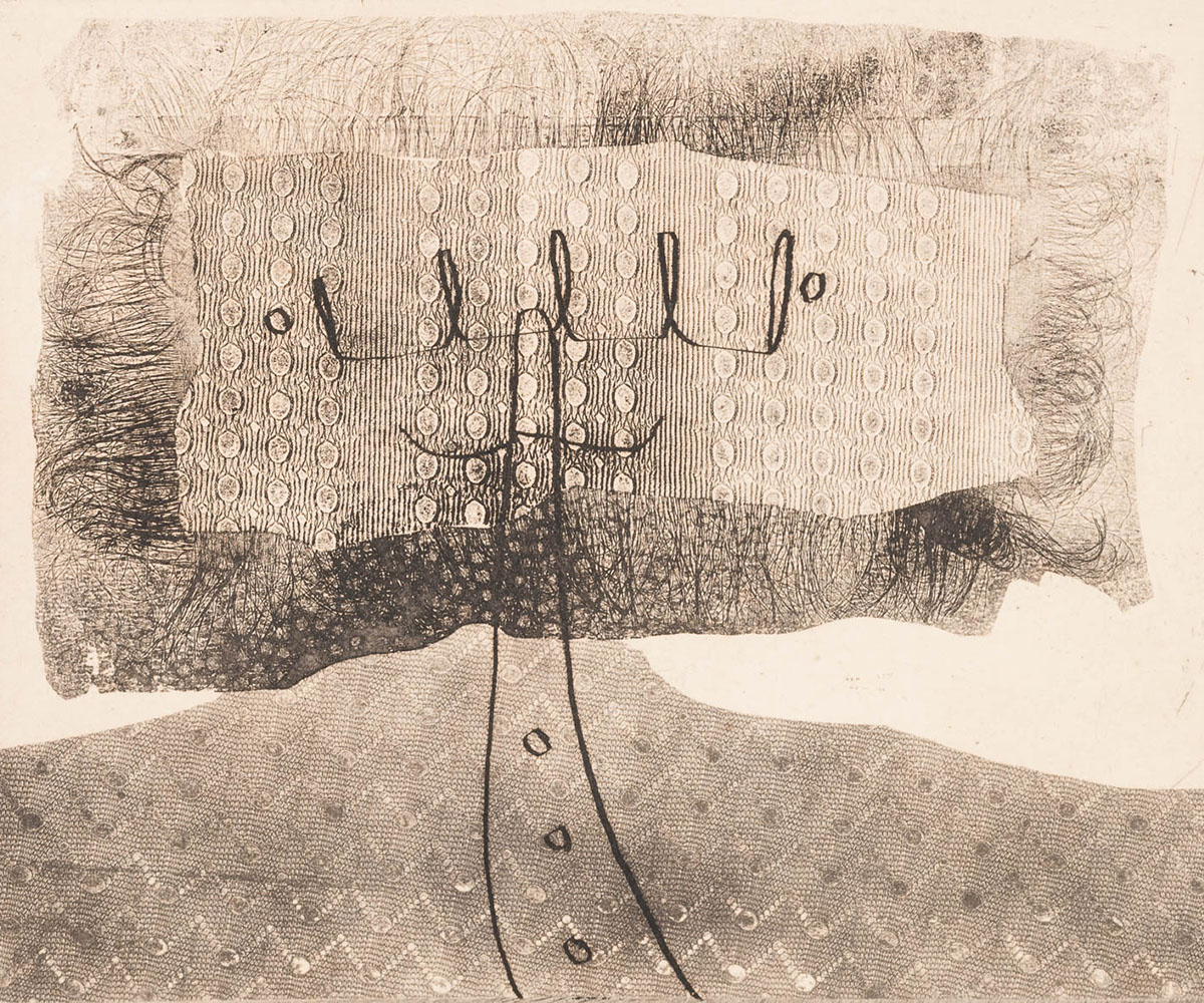 In 1968, he returned to West Bengal to head the graphics and printmaking department at Kala Bhavana, Shantiniketan. While there, he turned his focus back to other mediums and techniques, experimenting with paper-making and other paper-based mediums using rag-paper and papier-maché. Hore’s earlier explorations in abstraction in terms of colour planes, logography, calligraphy and texture led to a decisive shift in his practice in the early 1970s. His expertise in paper-making techniques culminated in Wounds (1970s), an innovative series of paper pulp–prints. Through these mostly monochromatic compositions, Hore revisited themes of violence and trauma, which had come to inhabit much of his artistic oeuvre. He used hot knives and rods to slash into pieces of clay, which were then used as moulds for his paper pulp. This resulted in prints with scarred, ripped, dented, torn and blistered surfaces — symbolising the wounds on human skin, and thereby the effects of violence and strife. In some cases, Hore added ink marks to create an illusion of blood.