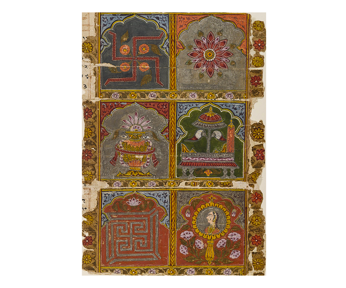Whereas swastika is a Sanskrit term meaning ‘aiding in well-being’, the symbol and its derivatives have been known by many names, including tetragammadion in Greek and fylfot in English. Of the many variations of the swastika, some of the most common ones are those with wavy legs and a dot in each quadrant used in Hinduism, and one used as a repeating motif with connected legs seen on panels in Grecian architecture. Among the many interpretations of the symbol, the right-facing swastika is commonly understood to be a solar motif signifying the Sun’s movement from east to west with a southward dip on the way, when observed from the northern hemisphere. The swastika is also seen as a symbol of fertility and prosperity.
