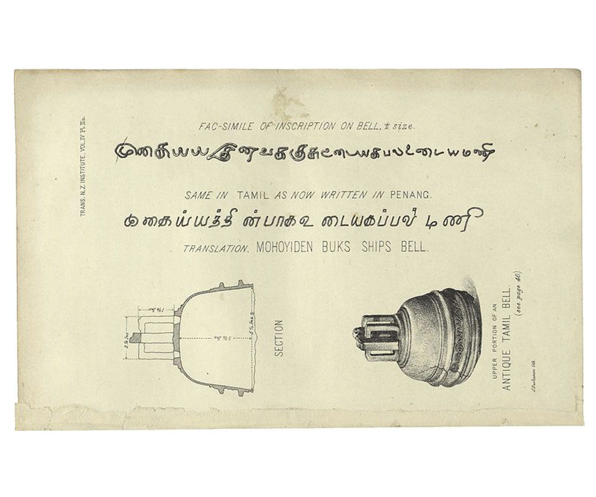 A partial ship’s bell made of bronze and bearing a Tamil inscription, the Tamil Bell, as it is commonly known, was discovered c. 1840 at a Maori village near Whangarei, in the northernmost part of New Zealand. Found with the clapper and the waist, or main shell, missing, only the topmost part of the bell survives. Comprising the bell’s crown and canons, the artefact is 16 centimetres high and 9 centimetres deep, with a 15-centimetre diameter, and weighs 2.6 kilogrammes. The inscription along the outside rim reads, in an archaic Tamil script, ‘Mohideen Baksh udiya kappal udiya mani’, which can be translated as ‘the bell of the ship of Mohideen Baksh’. Appearing in relief rather than engraved into the metal, the inscription is clear and well preserved, presumably protected from wear by the flanges or raised collars running along the crown above and below it.