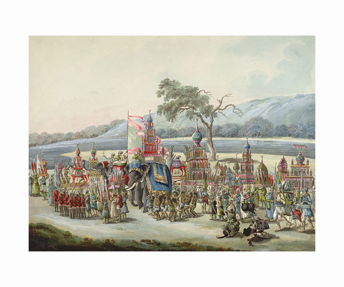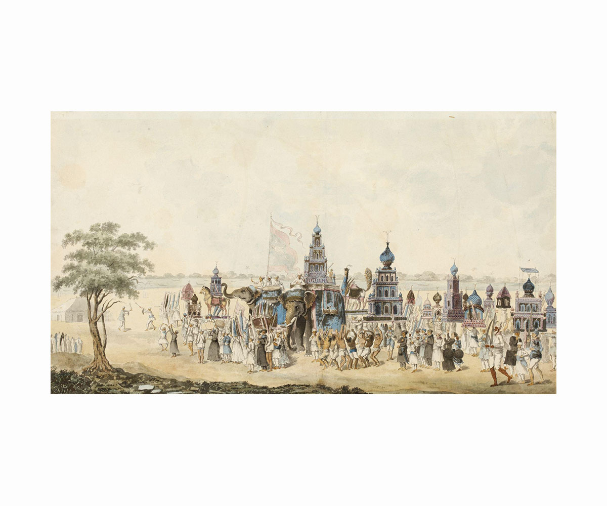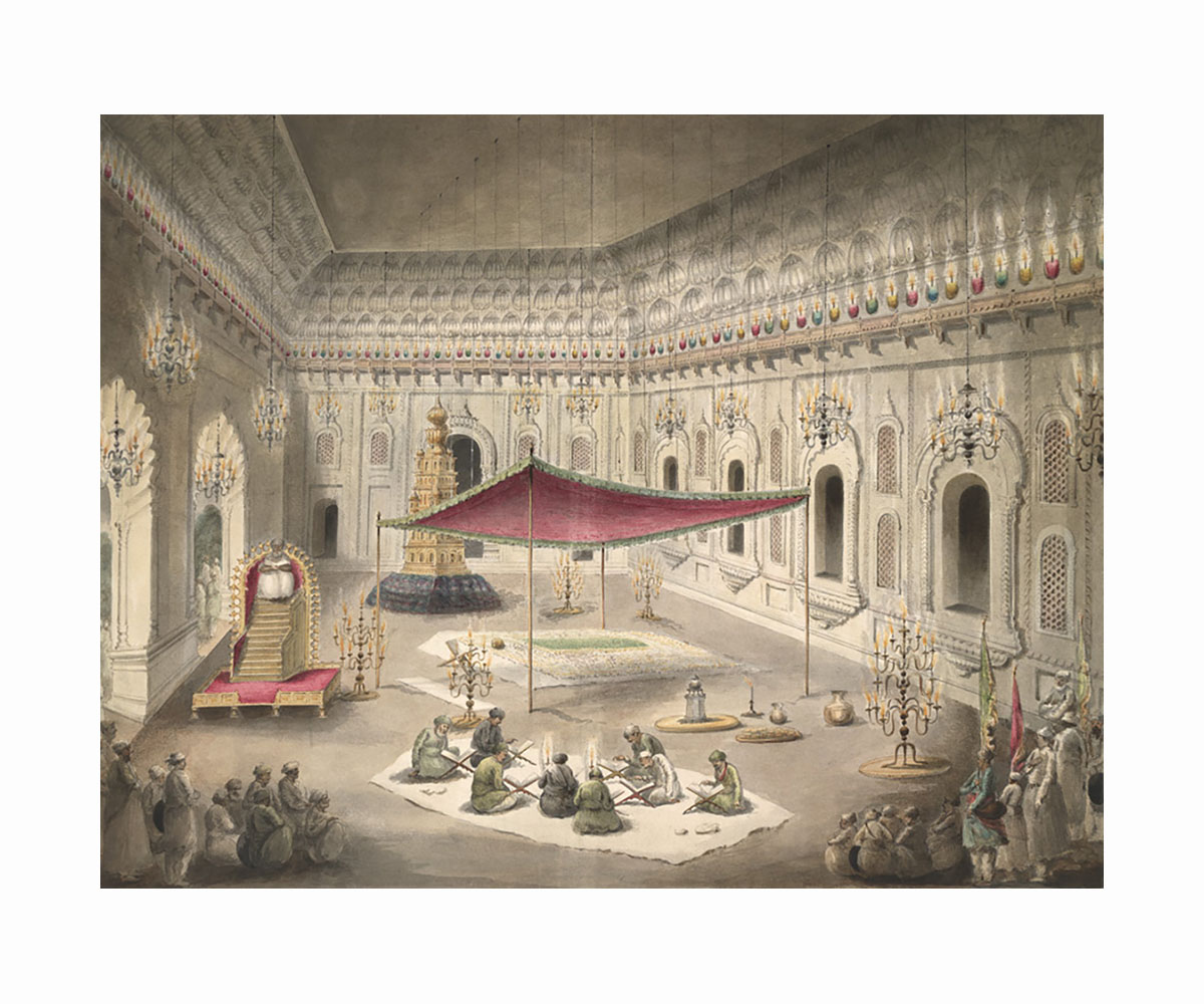 Interpretations of the tomb of Imam Hussain, the grandson of Prophet Muhammad, tazia (also ta’zia, taziya, tabt or taboot) is a shrine constructed to be a part of the procession on the day of Ashura. The day of Ashura is the tenth day in the month of Muharram when Imam Hussain is believed to have died in battle at Karbala in 680 CE, and is considered to be a significant narrative on martyrdom and sacrifice for Shia Muslims. It is believed that tazia arrived in India in the fourteenth century because of the Mongol ruler, Taimur, who paraded a replica of Hussain’s Karbala tomb around his military camp as a way of mourning. Some accounts also suggest that the popularity of the practice of tazias was brought about by the Mughals, who encouraged it as a way for members of the royal family, who weren’t able to visit the shrines in person, to see the shrine.