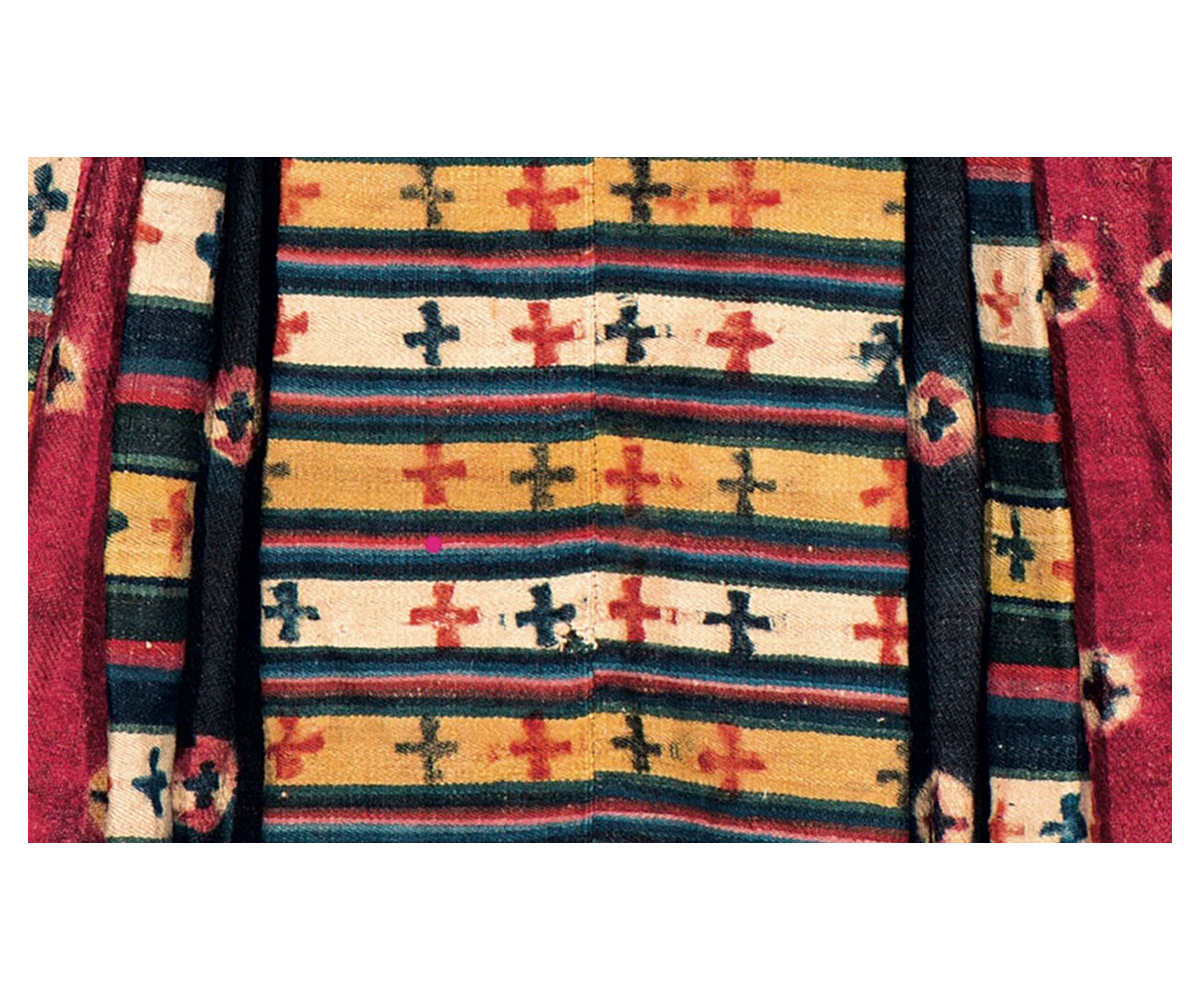 Sul-ma, woman’s woollen dress made from strips of Snambu cloth patterned with Thigma tie-dyed circles and cruciform motifs (detail); Ladakh, India; Late 19th–early 20th century; Wikimedia Commons
