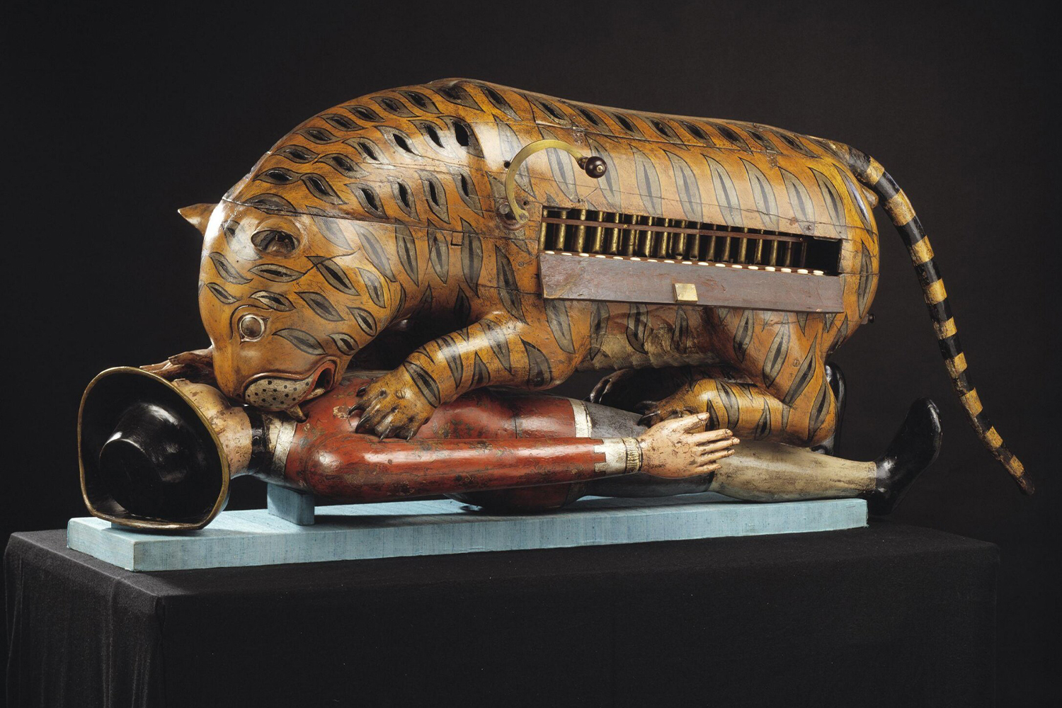 A six-foot long musical automaton depicting a tiger mauling an English soldier, Tipu’s Tiger is carved of Indian jackwood and was made around 1794–99, likely under specific instructions from Tipu Sultan.
