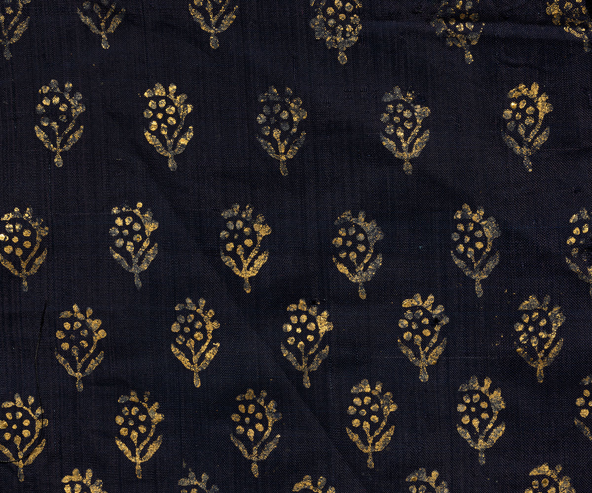 Fragment; India; c. 1800s; Block printed with gold leaf (varak) on dark blue dyed plain weave cotton muslin; 17.2 x 17.8 cm; Cleveland Museum of Art