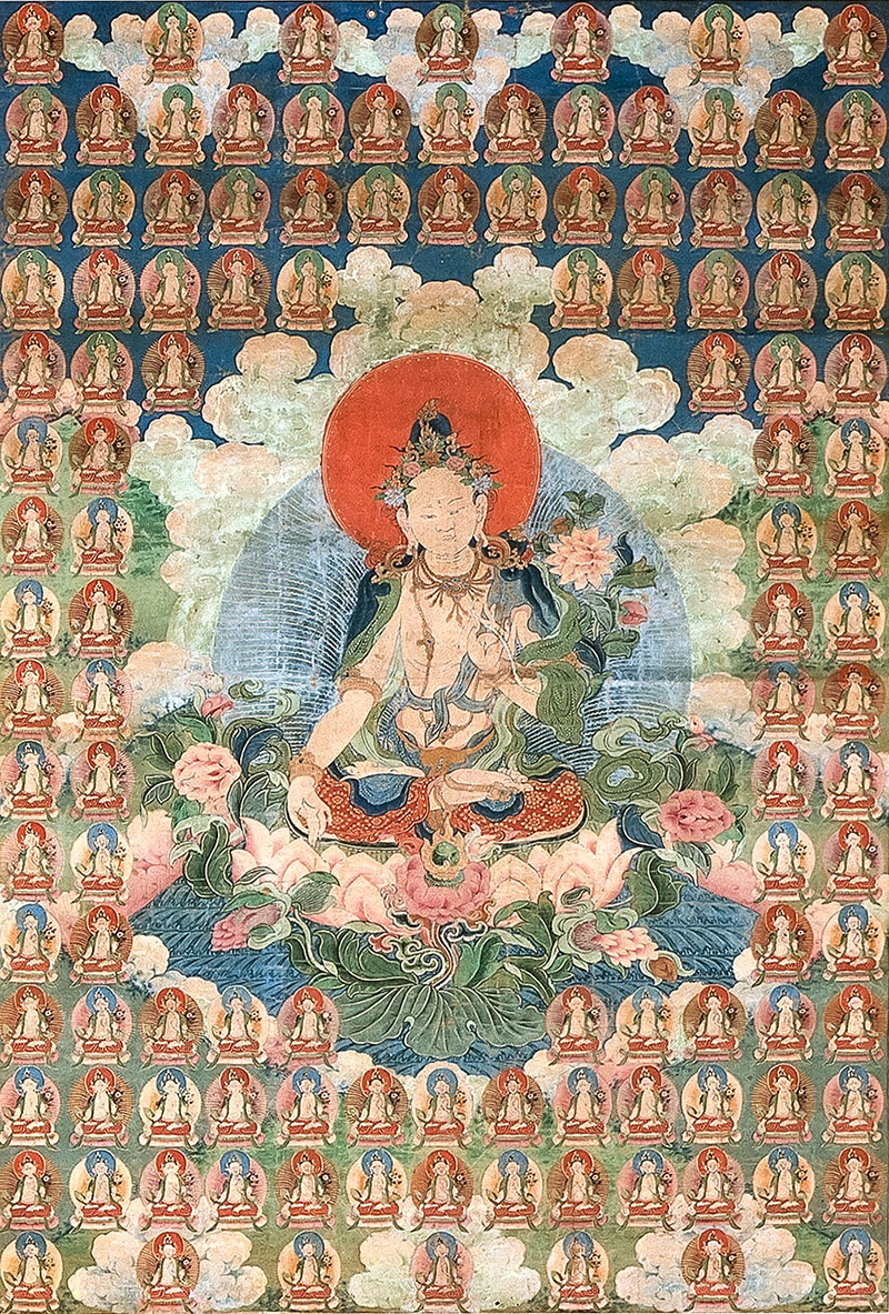In popular worship, the goddess is invoked in the face of disease and death through the recitation of a mantra, a pooja, meditation on the goddess and the worshipper’s identification with her, as well as through the commissioning of an image of White Tara that must be completed within twenty-four hours. The contemplation of Tara in worship is intrinsically linked to the worshippers’ ability to envision the goddess. Accordingly, she is described as a lunar figure that radiates powerful white beams of light that can potentially transform the world into a mandala and cleanse it of illusion. Worship of the goddess in the form of Wish-Fulfilling Wheel White Tara or Chintamanichakra Tara prescribes the visualisation of rings of coloured light emanating from the goddess.