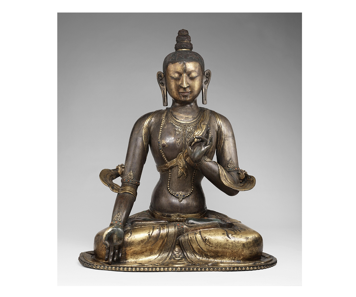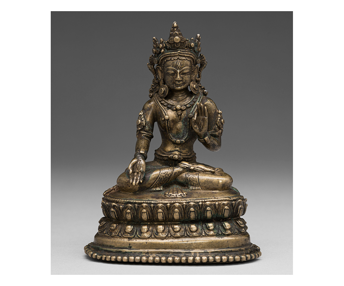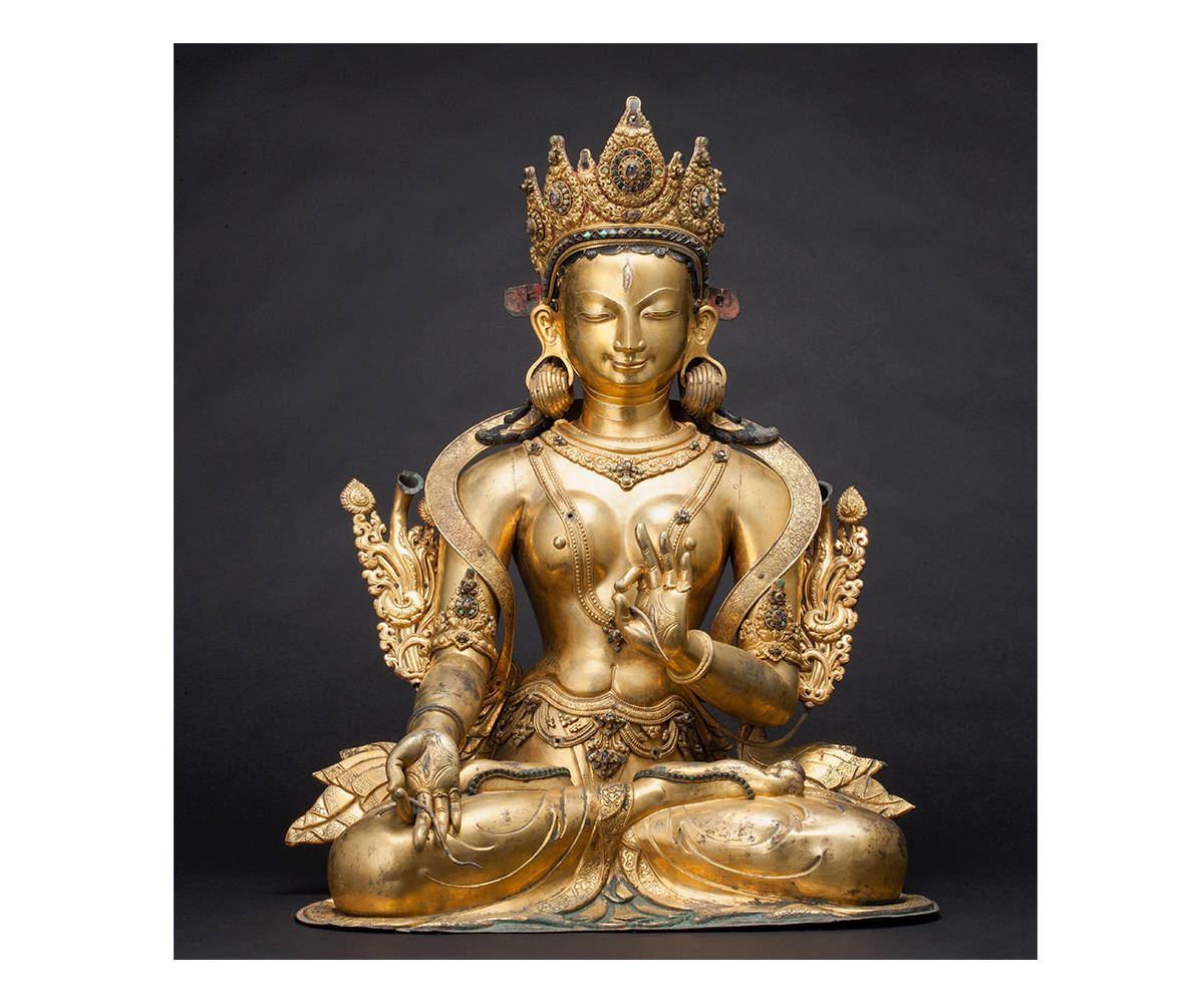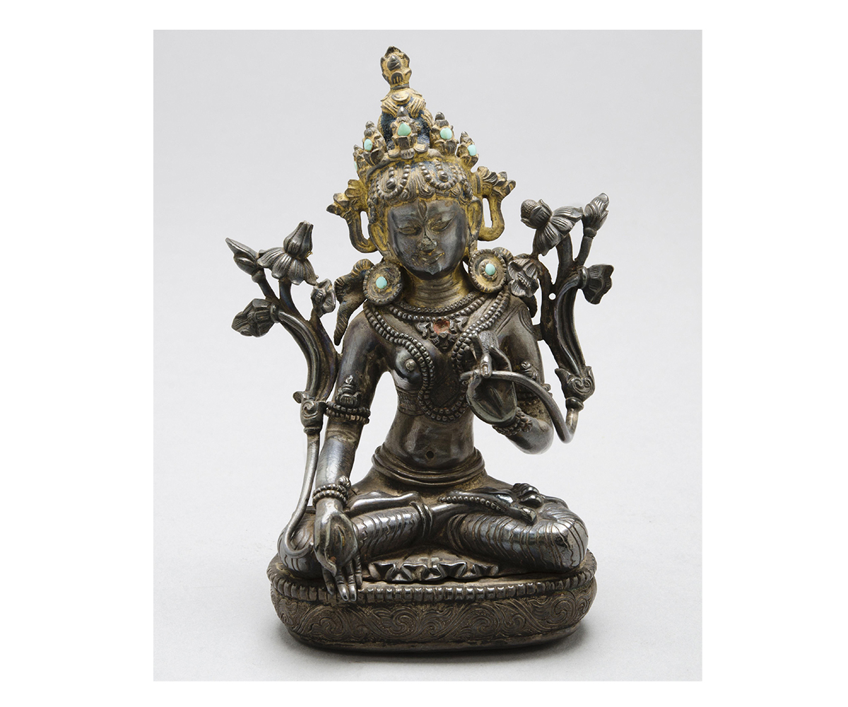 An aspect of the goddess Tara in the Buddhist pantheon, White Tara is worshipped primarily in Nepal and Tibet as a compassionate figure associated with longevity, good health and healing. Known by a variety of epithets in Sanskrit and Tibetan such as Sita Tara, Drolma Karma or simply Drolkar, Drolkar Yeshinkorlo or Chintamanichakra Tara meaning “Wish-Fulfilling Wheel White Tara” and Mrityuvanchana Tara or “One Who Cheats Death,” White Tara is identifiable in thangkas and other painted representations by her white colour, and in sculpture, by her padmasana posture on a lotus.