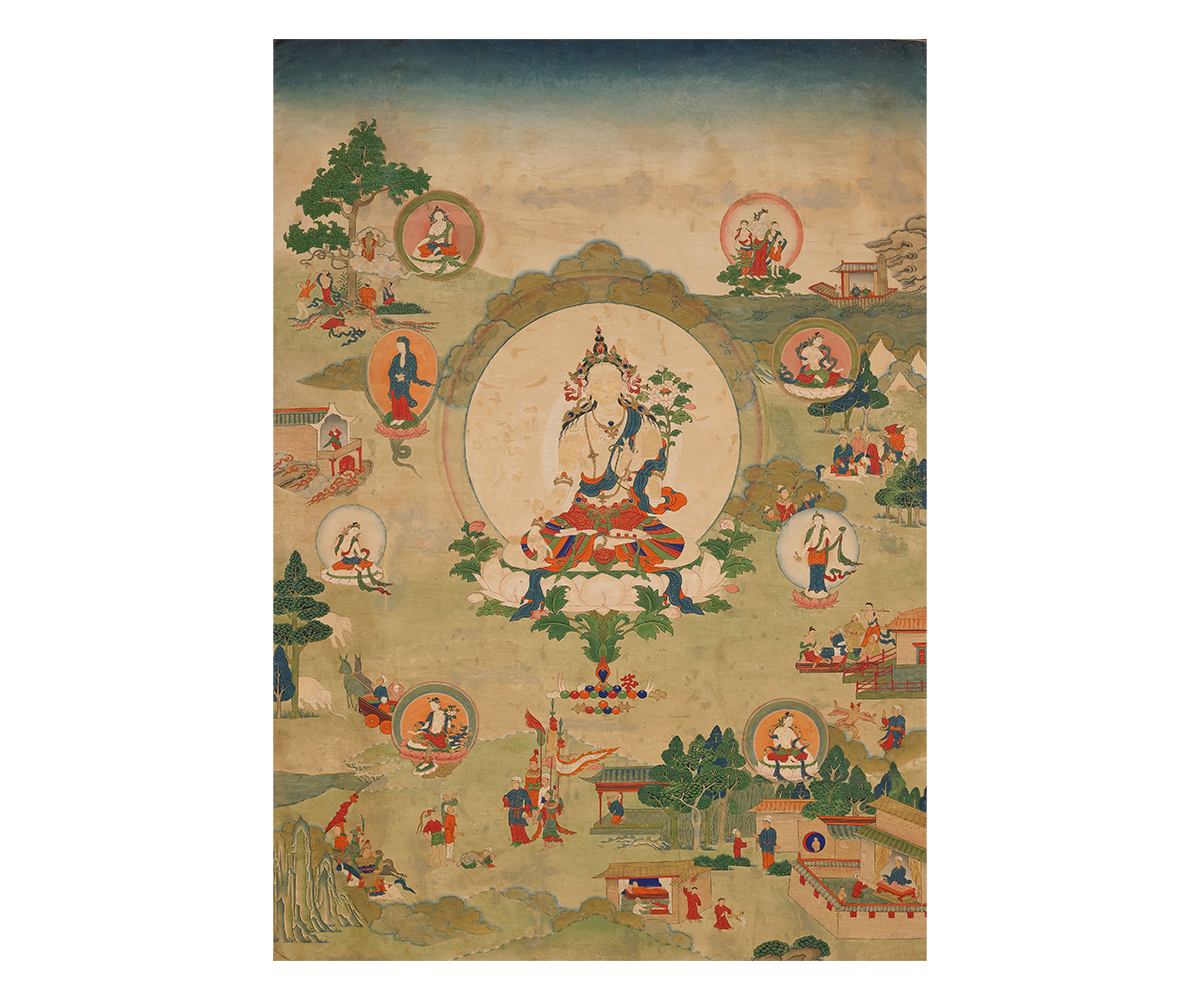 The ability to avoid death forms the central attribute around which the c. tenth century CE Buddhist scholar Vagishvarakirti based his three texts on White Tara, ordered under the title ‘Cheating Death’. In c. eleventh century, the cult of White Tara was introduced to other regions, notably Tibet, by the Buddhist scholar Atisha. Due to her ability to bestow longevity upon worshippers and through her powers that promote healing and cause the cessation of suffering, White Tara came to be included, and at times centrally depicted, in a trinity of healing deities associated with long life alongside Ushnishavijaya and Amitayus. In Tibetan Buddhism, mythological accounts of White Tara’s origin trace her to the bodhisattva Avalokiteshvara’s tears caused by worldly suffering. While some accounts suggest that White Tara and Green Tara arose together out of a pool of Avalokiteshvara’s tears, other accounts specify that White Tara emerged from the tears in Avalokiteshvara’s right eye. Another story rooted in popular mythology states that White Tara was reincarnated in Wen Cheng from China, one of the wives of the Tibetan ruler Songsten Gampo.