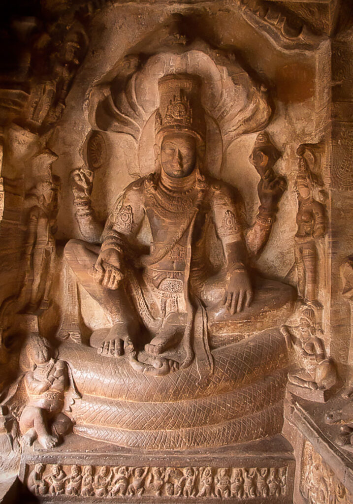 Also known as Para Vasudeva, it is a manifestation of the Hindu deity Vishnu. The conventional iconography of the form depicts Vishnu seated on the coils of the serpent Sesha, with his left leg folded and his left hand placed on his left knee. Sesha’s hood is shown to be covering his head, in the manner of a parasol. However, in the Tirumala Venkateswara Temple in Andhra Pradesh, Vishnu is depicted standing on the serpent, his head shielded by the snake’s hood.