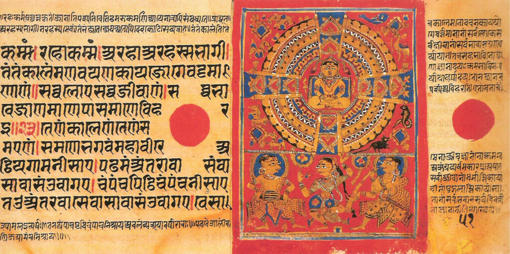 Mahavira attians Enlightenment (kevala jnana) and a Samosarana (divine preaching assembly); Patan, Gujarat, India; c. 1472. Photograph: Anishshah19 (2010), Wikimedia Commons
