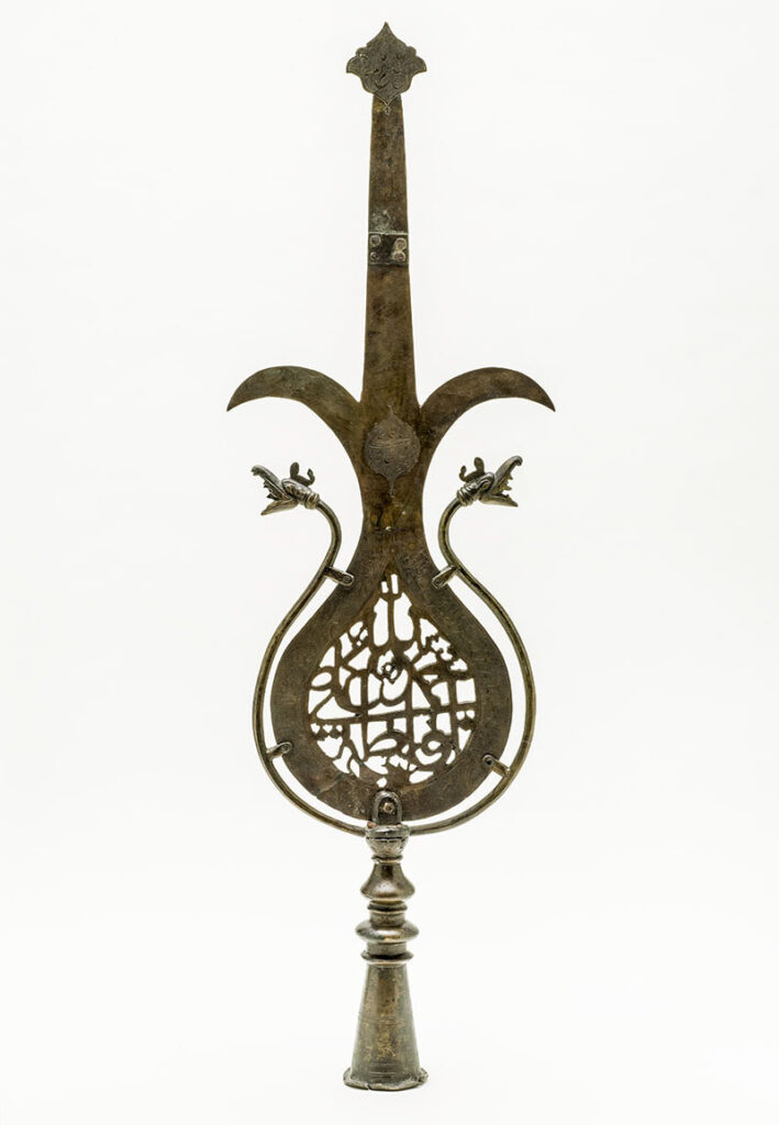 A religious processional object used by the Shi’a community on Ashura, the tenth day of Muharram. It is considered a symbolic reference to the first Shi’a imam Ali, the son-in-law of the Prophet Muhammad. It is typically curvilinear or teardrop shaped and made of gilded or cast bronze, brass or steel. It features Arabic and calligraphic inscriptions as well as several decorative elements such as dragons, and is topped with a hip knob (finial).