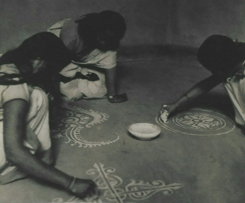 A ritual Bengali practice of making designs and paintings featuring religious motifs and patterns, typically made in white using a pigment derived from rice powder. It is traditionally made by women during festivals and ceremonies. From the Sanskrit alimpana, meaning “to plaster” or “to coat with.”