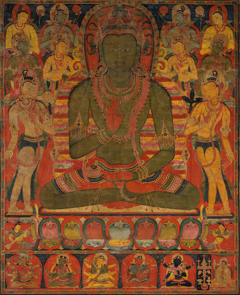 Buddha Amoghasiddhi with eight Bodhisattvas; Central Tibet; c. 1200–50; Distemper on cloth; 68.9 x 54 cm. The Metropolitan Museum of Art, New York