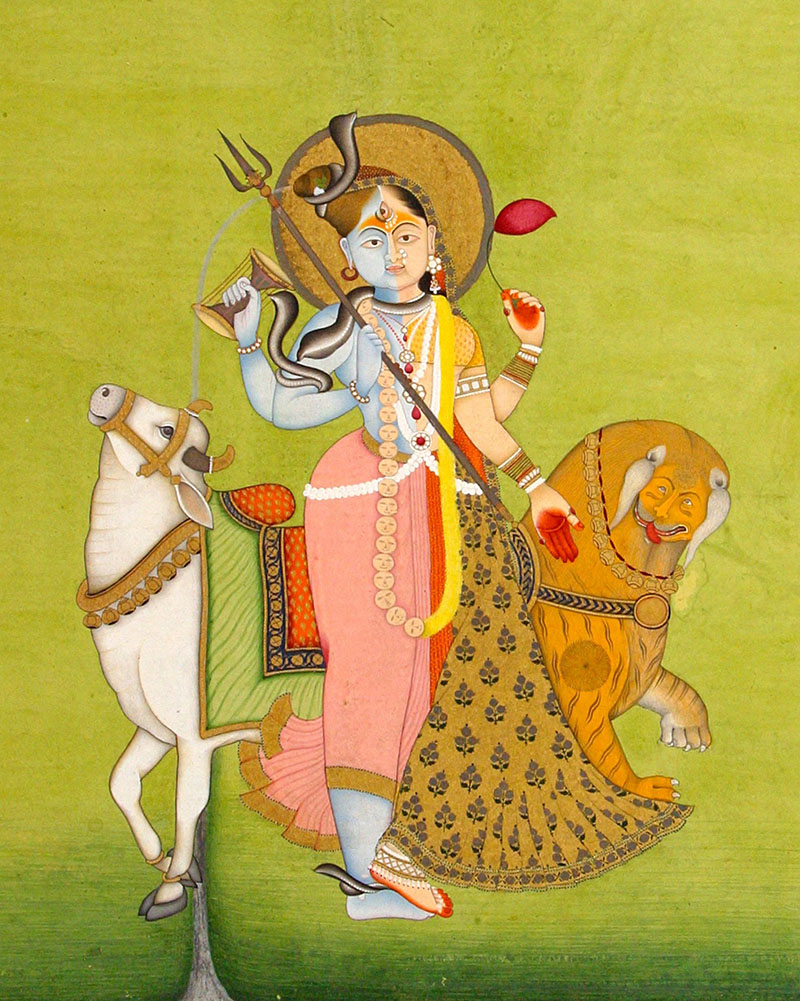 A composite form of the Hindu god Shiva and his consort Parvati, depicted equally split down the middle, half-male on the right and half-female on the left, representing the inseparability of the male and female principles. Found in a variety of artworks across India and South Asia, notably in relief sculptures in the caves at Badami and Elephanta.