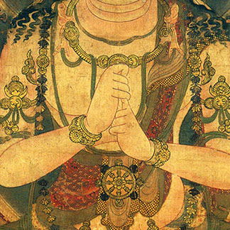 Also known as the bodhyangi mudra, it means the “mudra of the six elements” or the “fist of wisdom,” and is primarily associated with Vairochana. It is made by gripping the index finger of the left hand with the right hand.