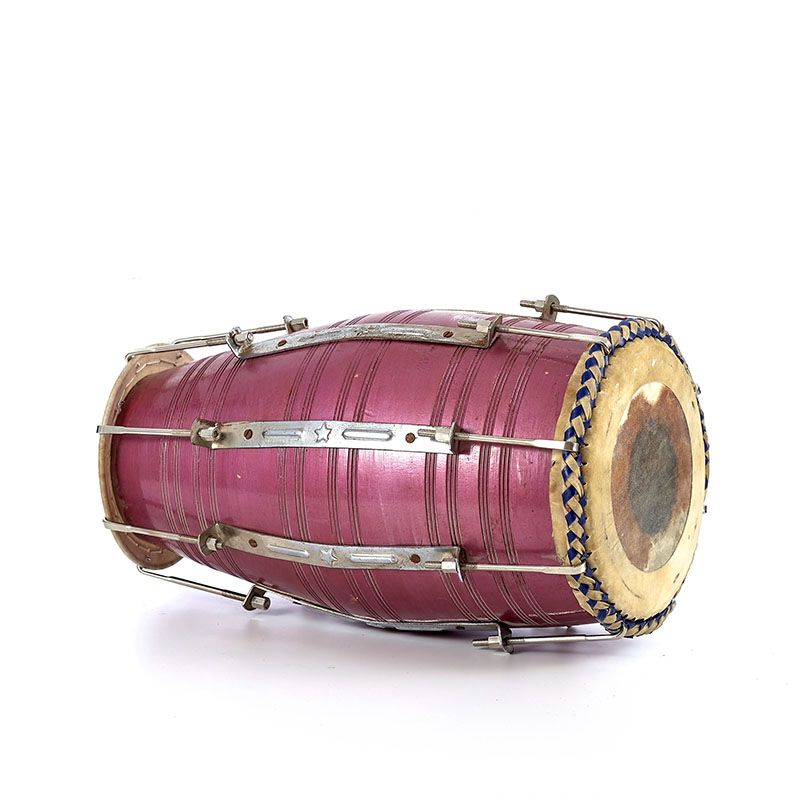 A South Asian percussion instrument, it is a two-headed drum with a wooden body and two differently sized faces. The larger face is covered with buffalo skin while the smaller is covered in goat skin. The body is also laced with cotton rope with steel rings or pegs to manipulate the tension while playing. During a performance, it can be held on the performer’s lap or played while standing up or pressed down with one knee while seated on the floor. It is popular in Indian folk music and other forms of Indian diasporic music.