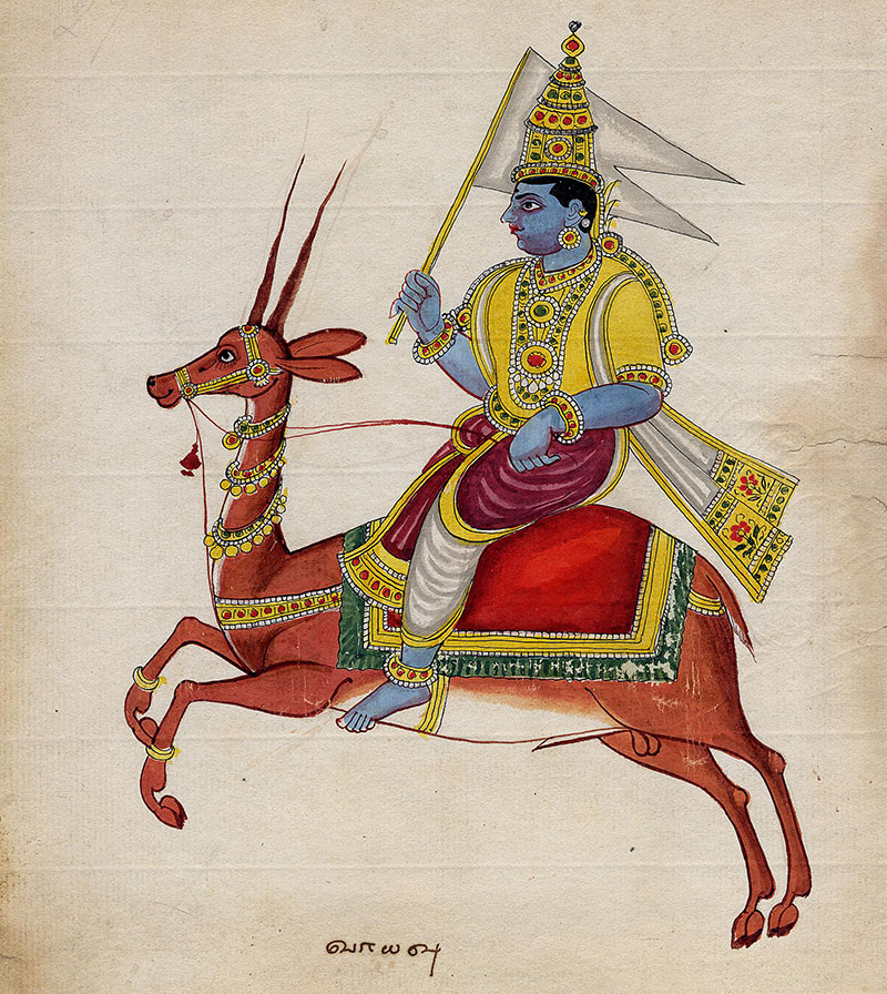 Vayu, riding a bejewelled gazelle and holding a dhvaja; Company school; Thanjavur, India; c. 1814; Gouache painting on paper; 25 x 19.3 cm. The Trustees of the British Museum