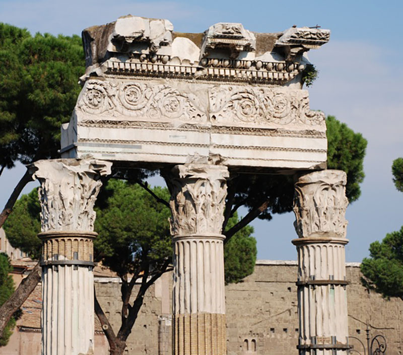 A horizontal band resting on pillar capitals, they are divided into three parts — the architrave (the bottom), the frieze (the middle) and the cornice (the topmost, underneath the roof).