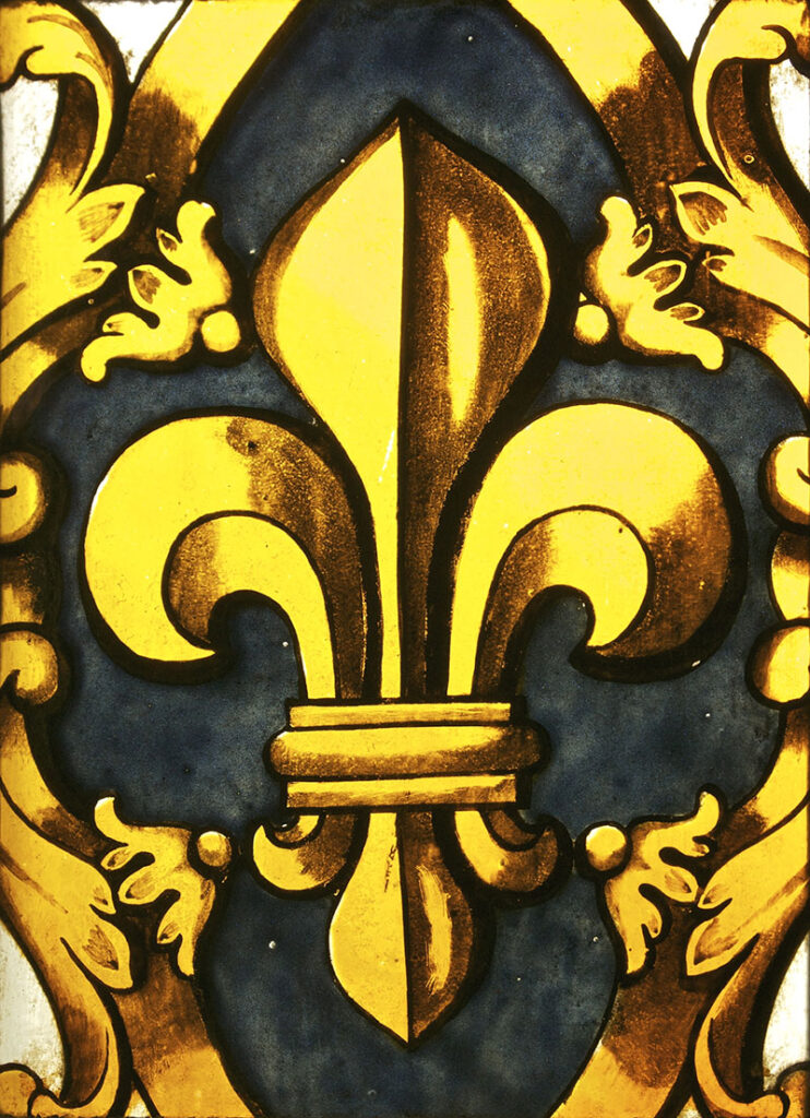 From the French fleur, meaning “flower,” and lis, meaning “lily,” it is a decorative element or symbol commonly associated with the monarchial period in France as well as the Roman Catholic Church. It consists of three flower petals bound at their base.