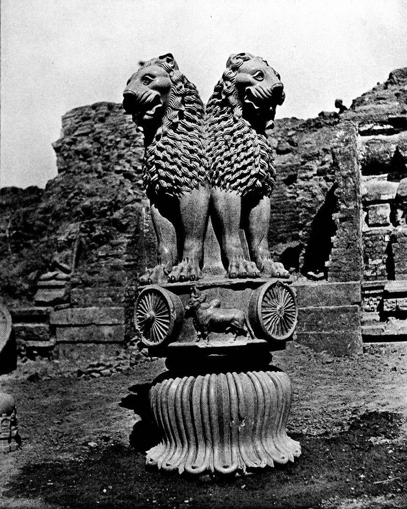 Lion Capital of the Sarnath Pillar, as discovered; Vincent Arthur Smith, Archaelogical Survey of Mysore; Bihar, India. Photograph: Shyamal (2010), Wikimedia Commons