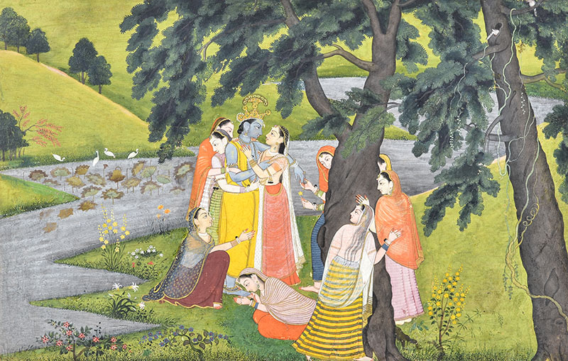 Krishna and the gopis on the bank of the Yamuna river, folio from the second or Tehri Garhwal Gita Govinda; India; c. 1775–80; Opaque watercolour and gold on paper; 16.2 x 25.7 cm. The Metropolitan Museum of Art, New York