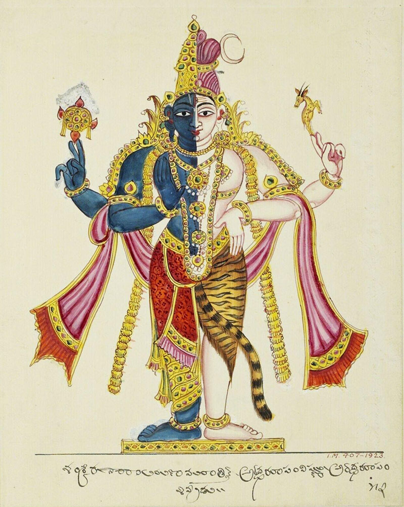 A deity who represents the combined aspects of Vishnu (Hari) and Shiva (Hara). Also known as Shankaranarayana, the fused body of the deity represents the dark-skinned Shiva on the right with a crescent moon in his matted hair and trishula (trident), and a pearlescent Vishnu on the left wearing a crown and holding a conch and the sudarshan chakra.