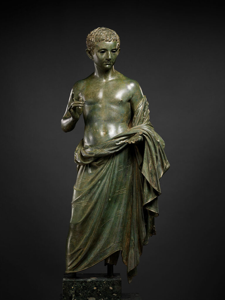 A type of garment worn by men and women in ancient Greece, it was an unstitched piece of rectangular cloth that could be draped in different ways. Commonly worn over the left shoulder, it was usually indicative of the wearer’s high status in society.