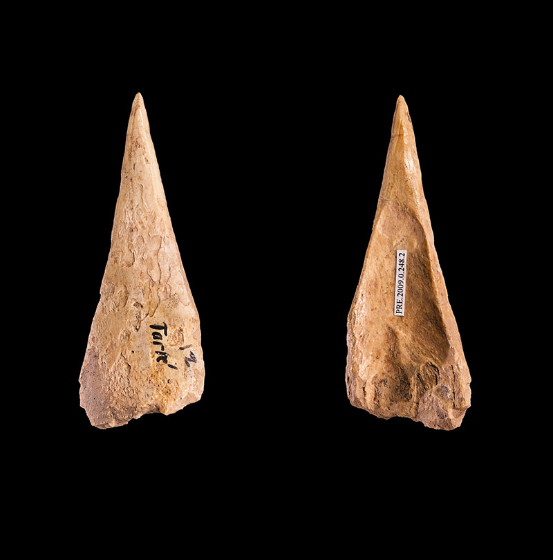 A tool made from shaping human or animal bone and used by prehistoric people as tools as well as to create cave paintings such as hand stencils. Hollowed bones were also shaped into spear tips, hooks, clubs and pipes that were used to blow pigment onto the rock surface.