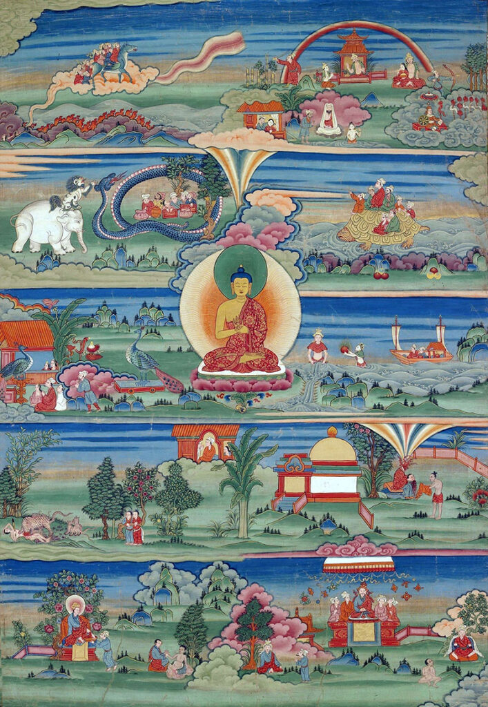 A large collection of approximately 550 stories about the Buddha’s former lives in both human and animal form. The stories are mostly set in the Indian subcontinent and are dated between 300 BCE and 400 CE. Some of the narratives are part of the Pali canon in Theravada Buddhism. Several of the stories are also the primary subjects of the Ajanta Cave murals.