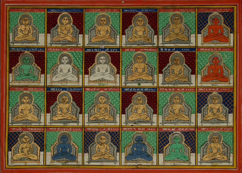 Also known as Tirthankaras, jinas are teachers and guides who lead their followers on the path of dharma and are central to Jain devotional practices. The twenty-four jinas are typically depicted in either a seated padmasana posture or standing with their legs joined together, and are distinguished by a diamond-shaped mark on their chest, called srivatsa.