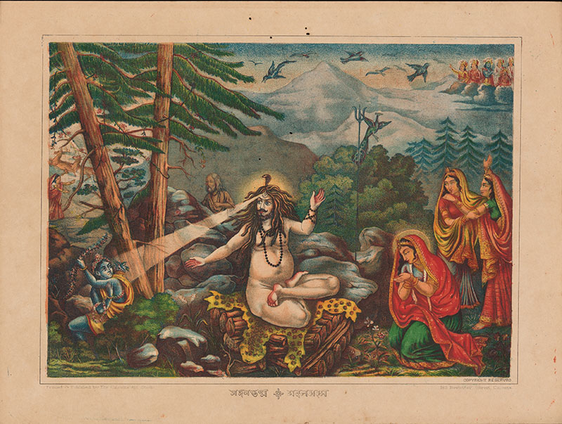 A depiction of the mythological episode of the Kamadahana, which means “the incineration of Kama” in Sanskrit. It shows the Hindu deity Shiva destroying Kama, the Hindu god of love, for disturbing his meditation.