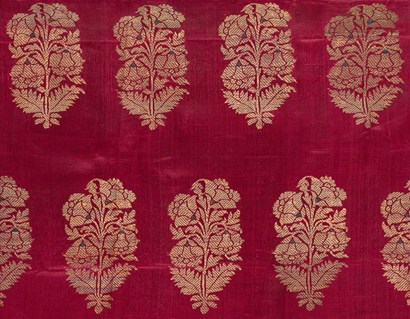 Meaning “little dream,” it is a woven brocade, characterised by a dense and rich zari work on the surface that renders the underlying silk fabric almost invisible. The complex weave was popular in the Mughal era, at which time production was centred in present-day Gujarat and the city of Benaras (Varanasi). Benaras remains an important centre of kinkhwab-weaving today.