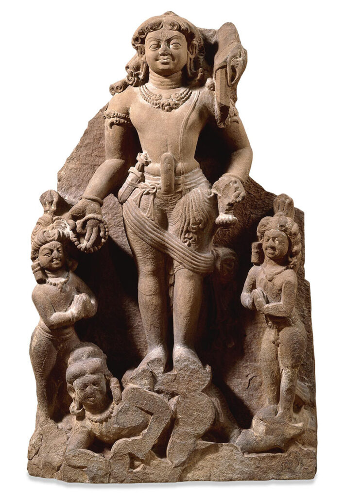 A proponent of the Shaivite cult, Lakulisha is often considered the founder of the Pashupata sect. According to the Linga Purana, he is the final avatar of Shiva and is associated with yoga. He is depicted as a naked yogi, either seated or standing, holding a staff in his left hand and a citron fruit in the right. His urdhavalinga, or erect phallus, is a distinctive part of his iconography and represents the vital energies associated with saintly celibacy.