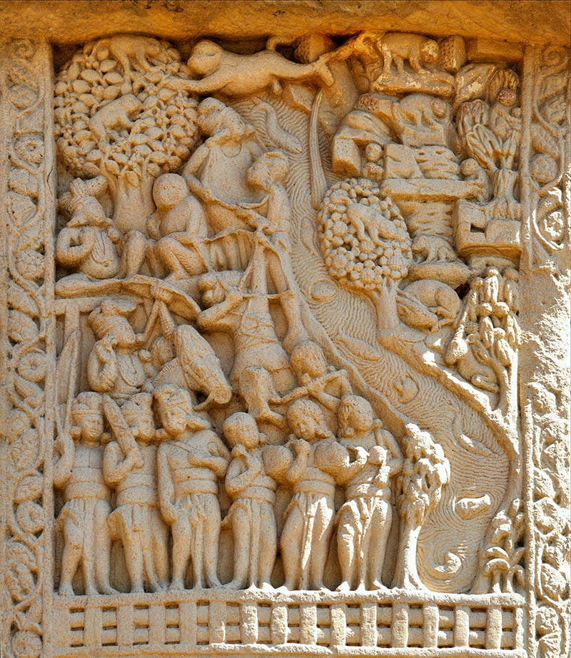 One of the Jataka tales, it tells the story of the bodhisattva‘s life as a monkey king who stretched his body like a bridge across part of a river to help his subjects escape an attack by humans. Depictions of this tale can be found at the Sanchi Stupa and the Bharhut Stupa.
