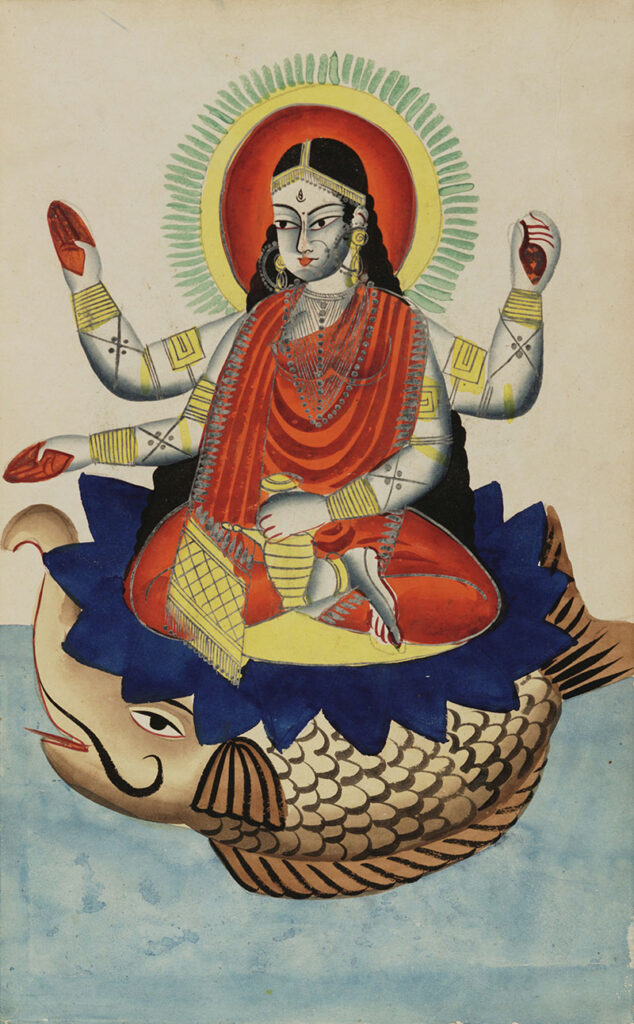 The equivalent of the Capricorn Zodiac sign within Hindu astrology, it is a mythical sea creature that is believed to be the mount of the deities Ganga, Narmada and Varuna. It is often depicted with a terrestrial (elephant, antelope etc.) front half and an aquatic (fish, crocodile etc.) back half.